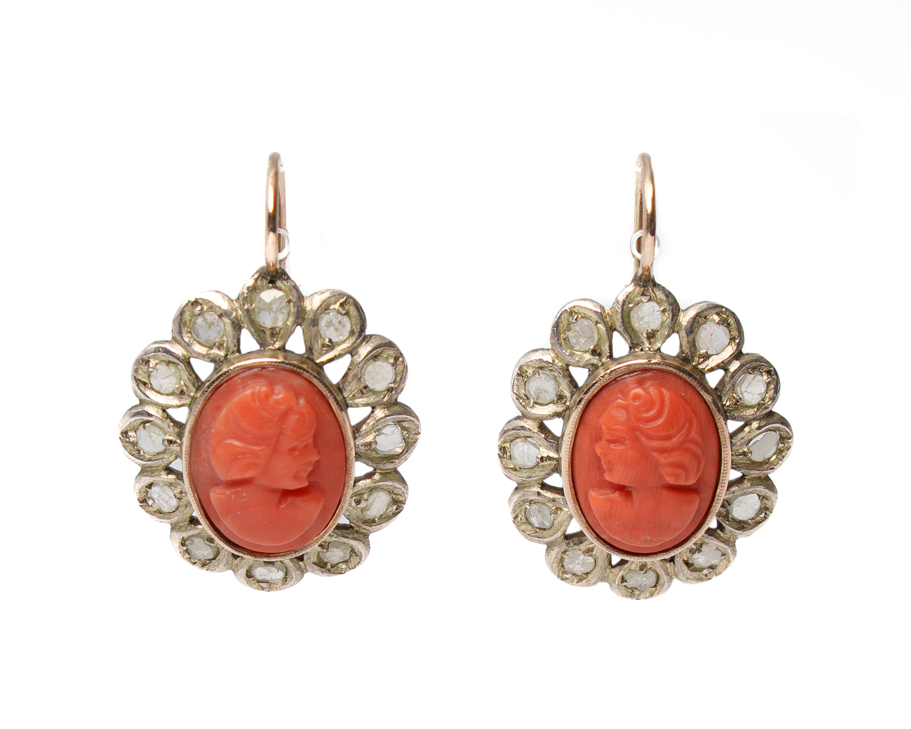ORECCHINI in oro giallo 9 KT e argento con diamanti tre facce ct. 0.20 peso di stima e cammei in corallo raffiguranti "Profilo femminile" (g. 13,90).
