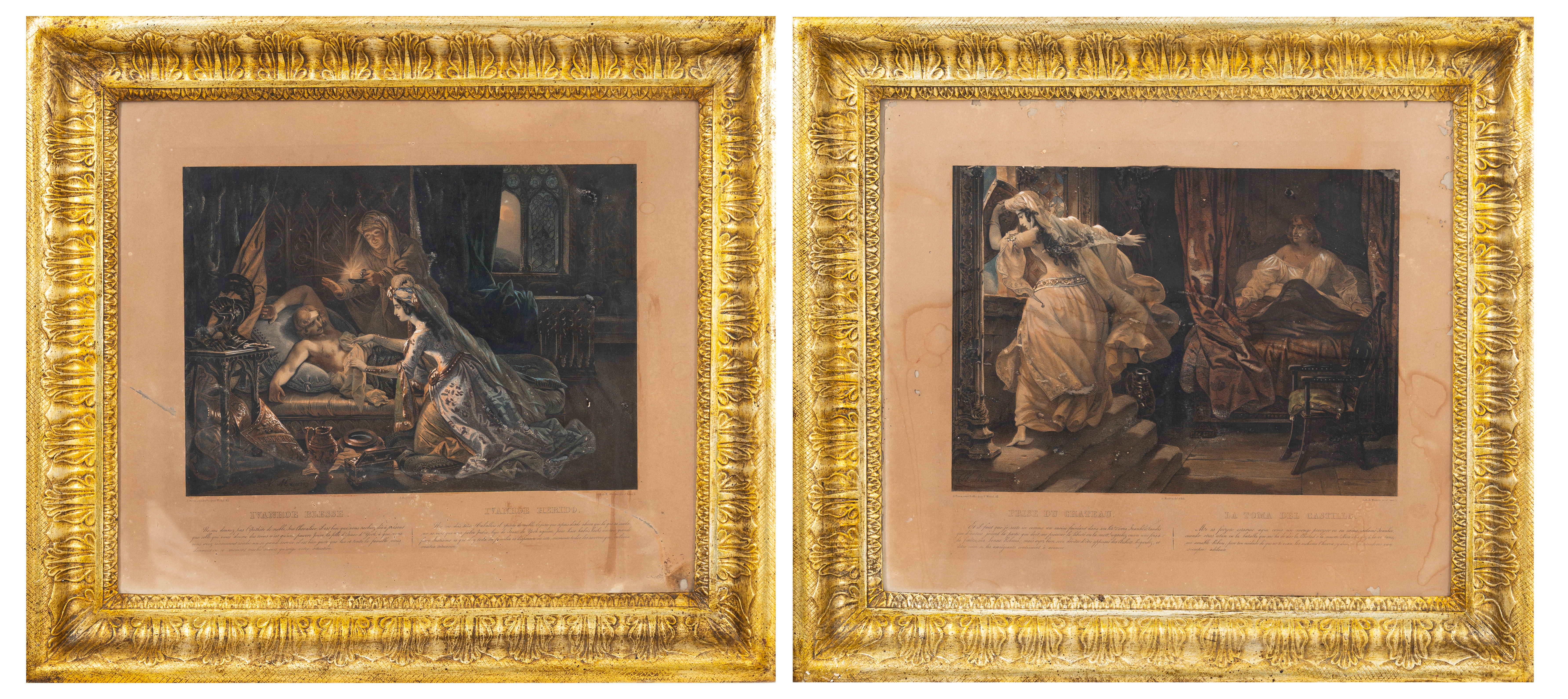 Coppia di cornici in legno dorato ad argento e mistura con all'interno incisioni ritoccate a mano raffiguranti "Prise de Chateau" e "Ivanhoe Blesse".