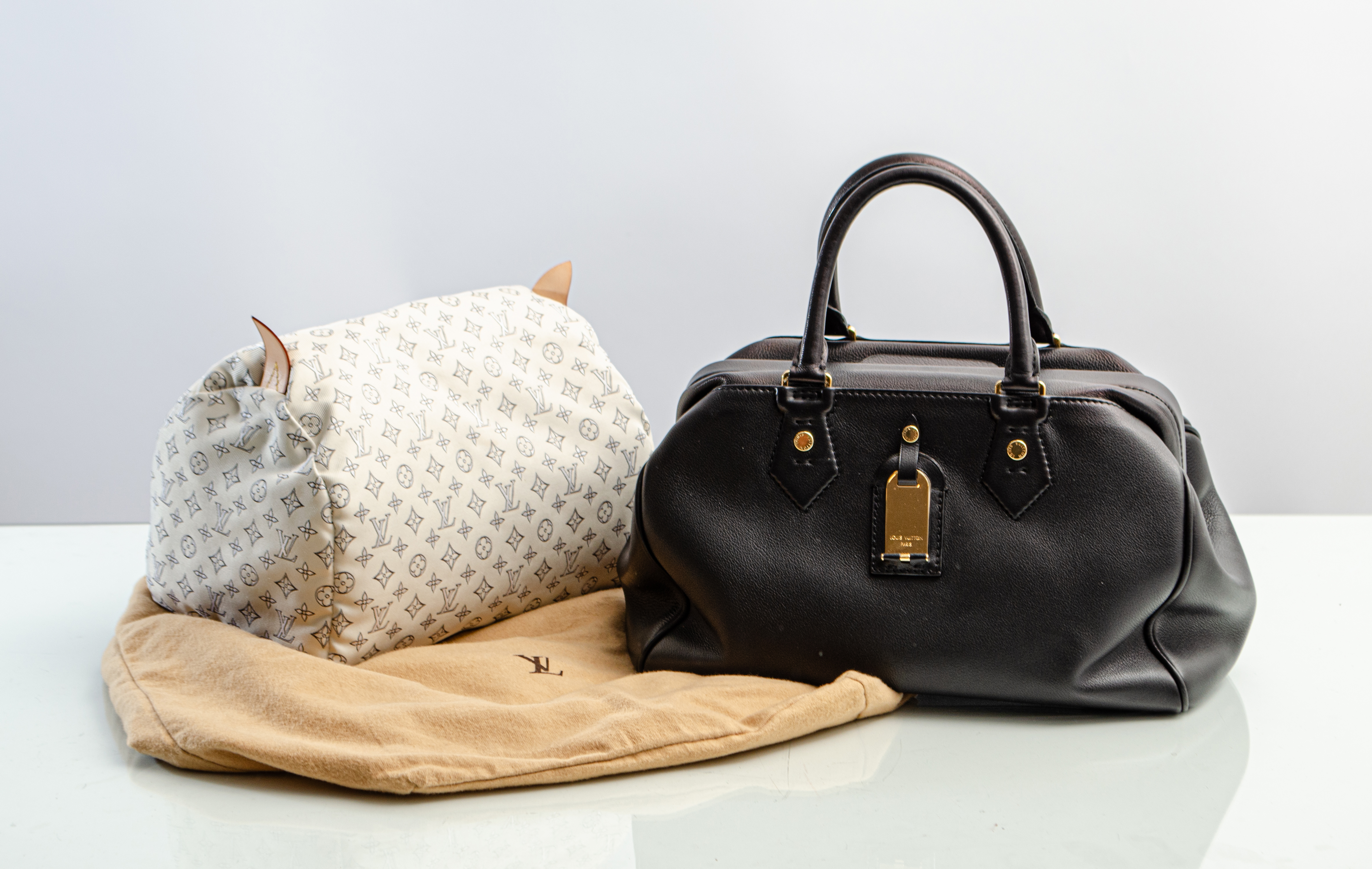 Borsa a mano edizione limitata modello “Intrigue Cinema” in pelle nera, corpo doctor bag, logo sul fronte, hardware dorato, due manici tubolari in pelle, dotata di cuscino imbottito. Minuterie in metallo dorato. Marchio di produzione.