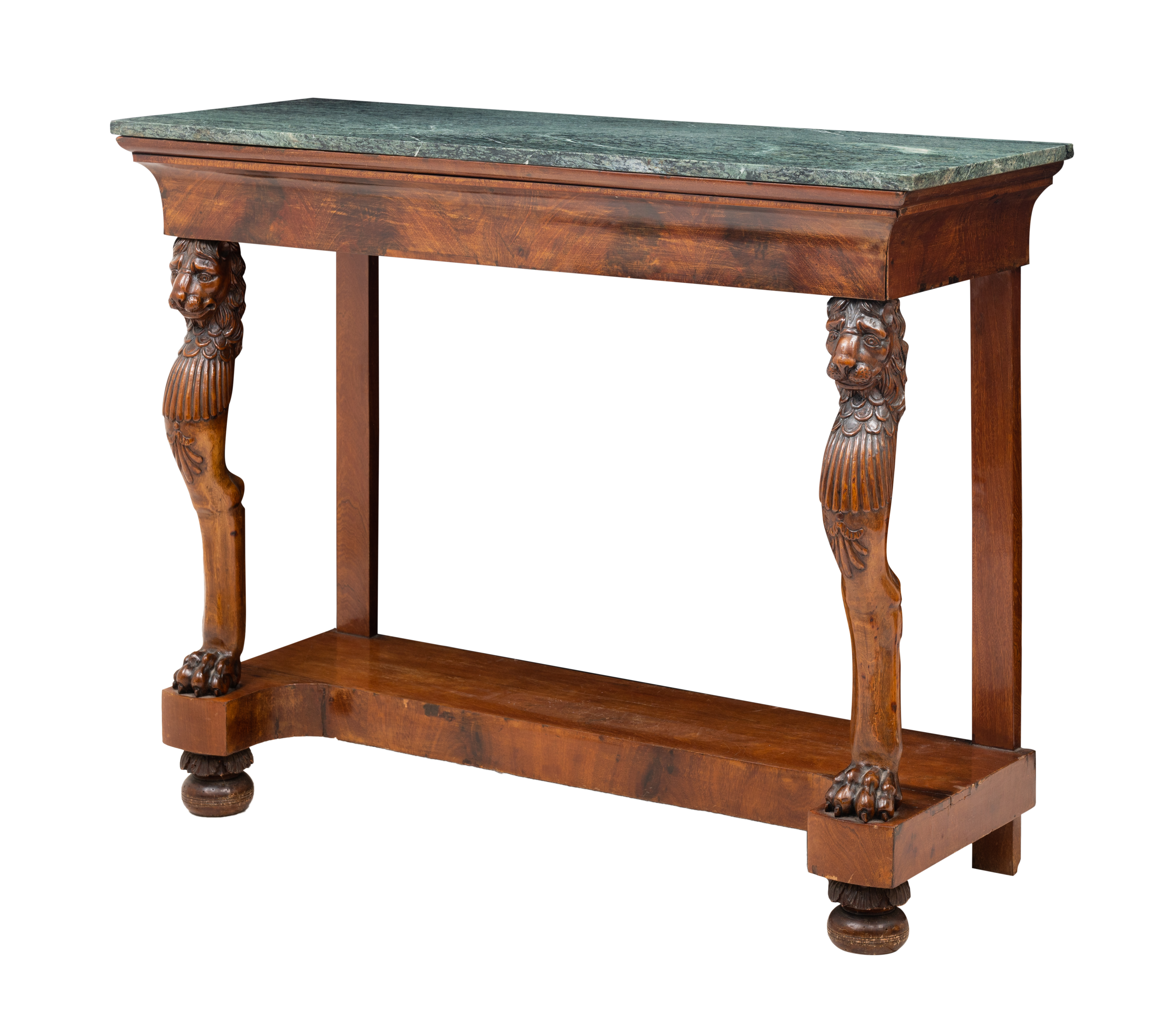 Consolle Impero in legno di mogano e piuma di mogano, piano in marmo verde delle Alpi.