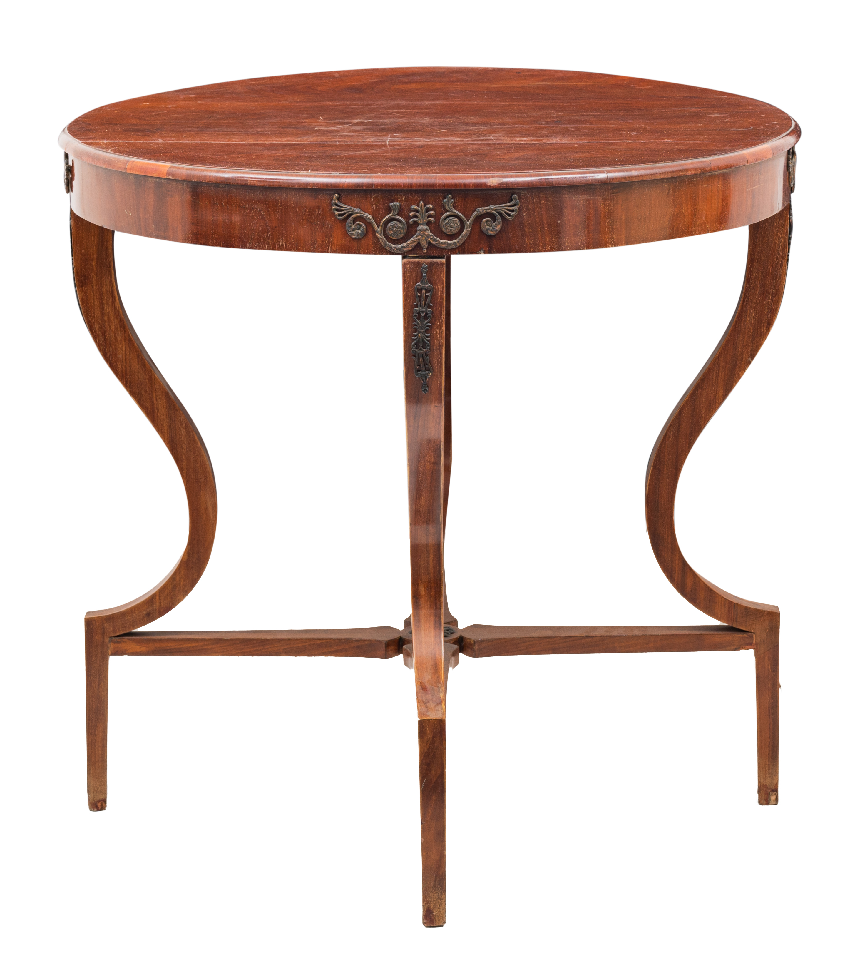 Tavolino Impero da centro in legno di mogano, fregi in ottone, piedi a sciabola con crociera.