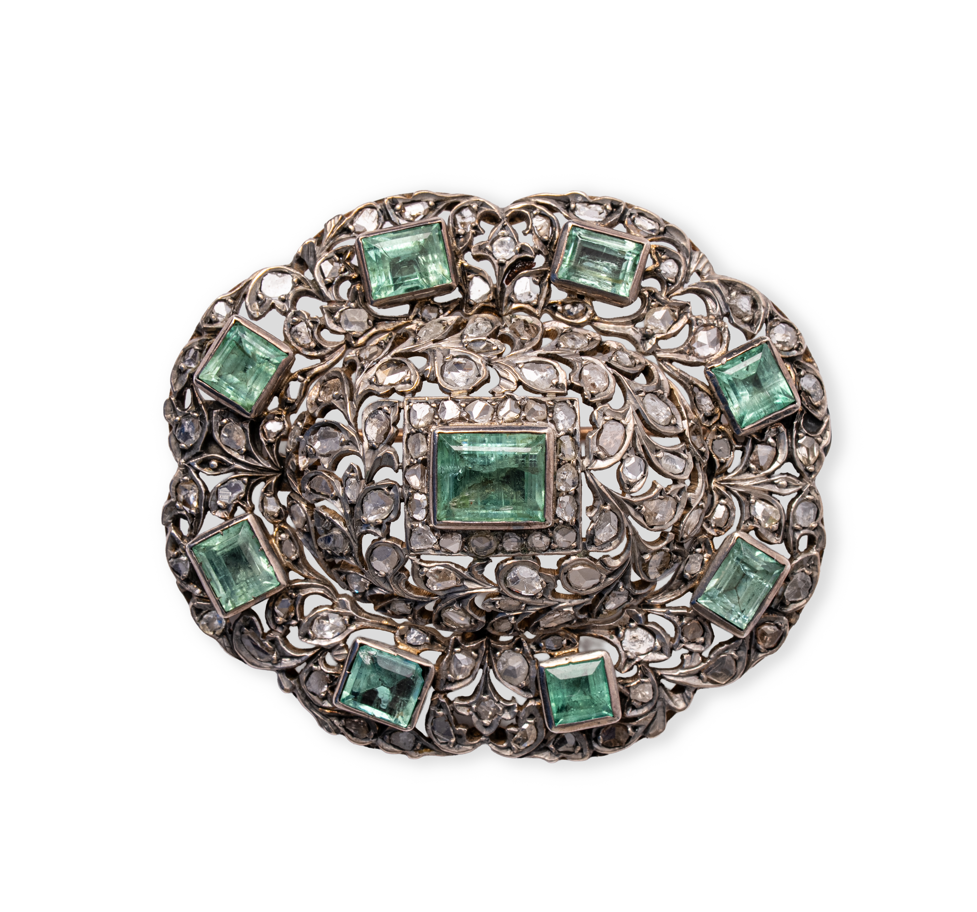 SPILLA in oro giallo 9 KT e argento con smeraldi ct. 3,00 peso di stima e diamanti ct. 1,00 peso di stima (g. 22,70) (usure).