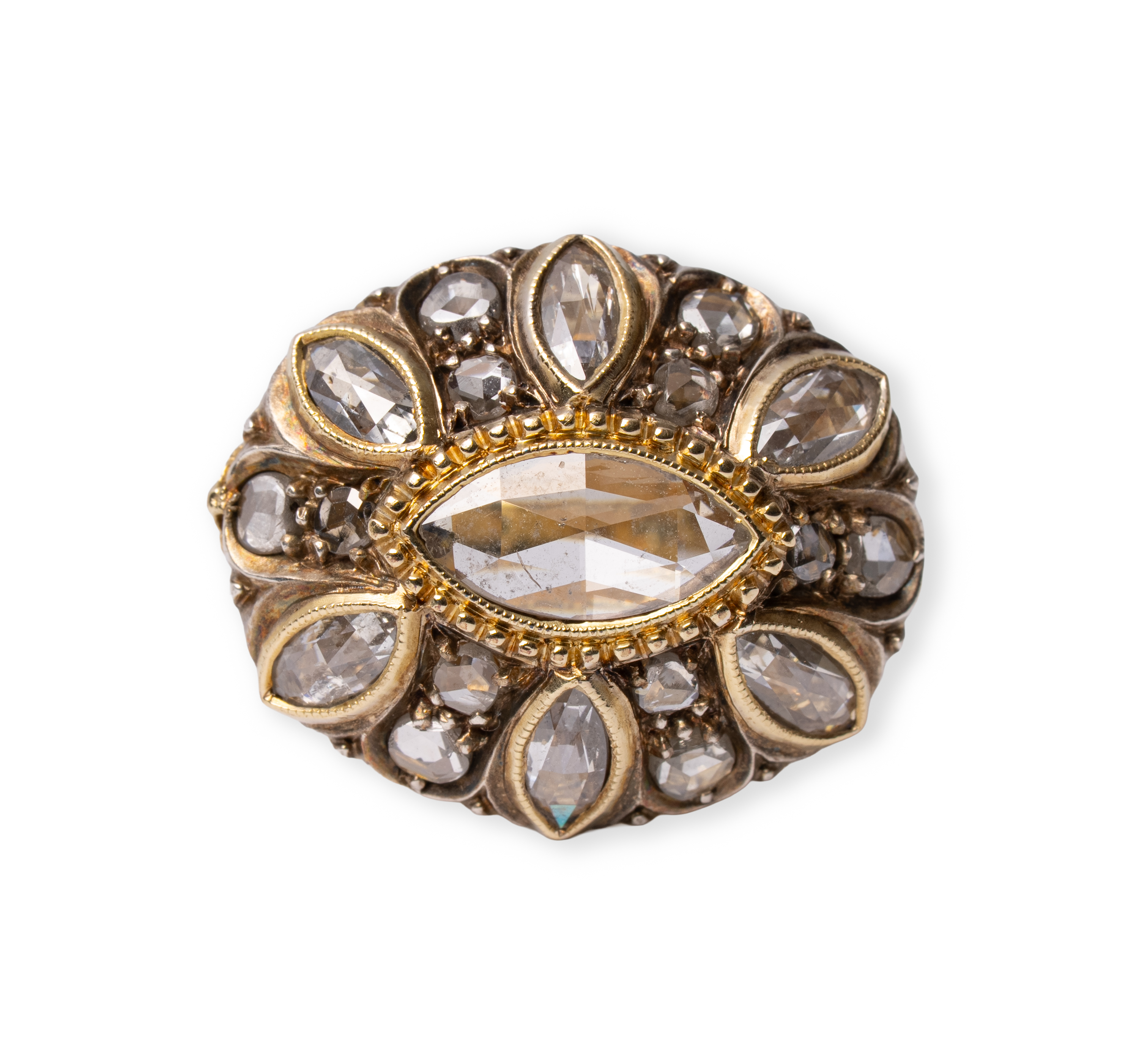 ANELLO in oro giallo 18 KT con diamanti vecchio taglio ct. 0,65 peso di stima (g. 8,60).