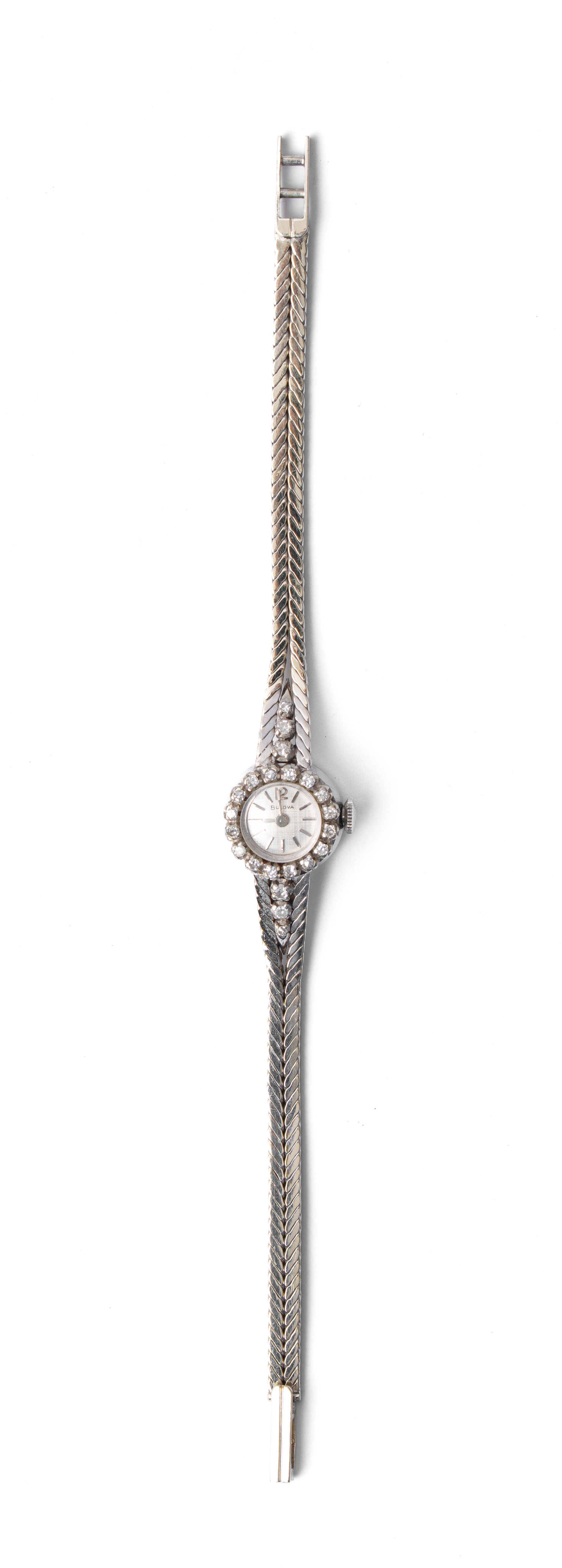 OROLOGIO BULOVA in oro bianco 18 KT con diamanti taglio huit/huit ct. 0,10 peso di stima, carica manuale (g. 20,50).