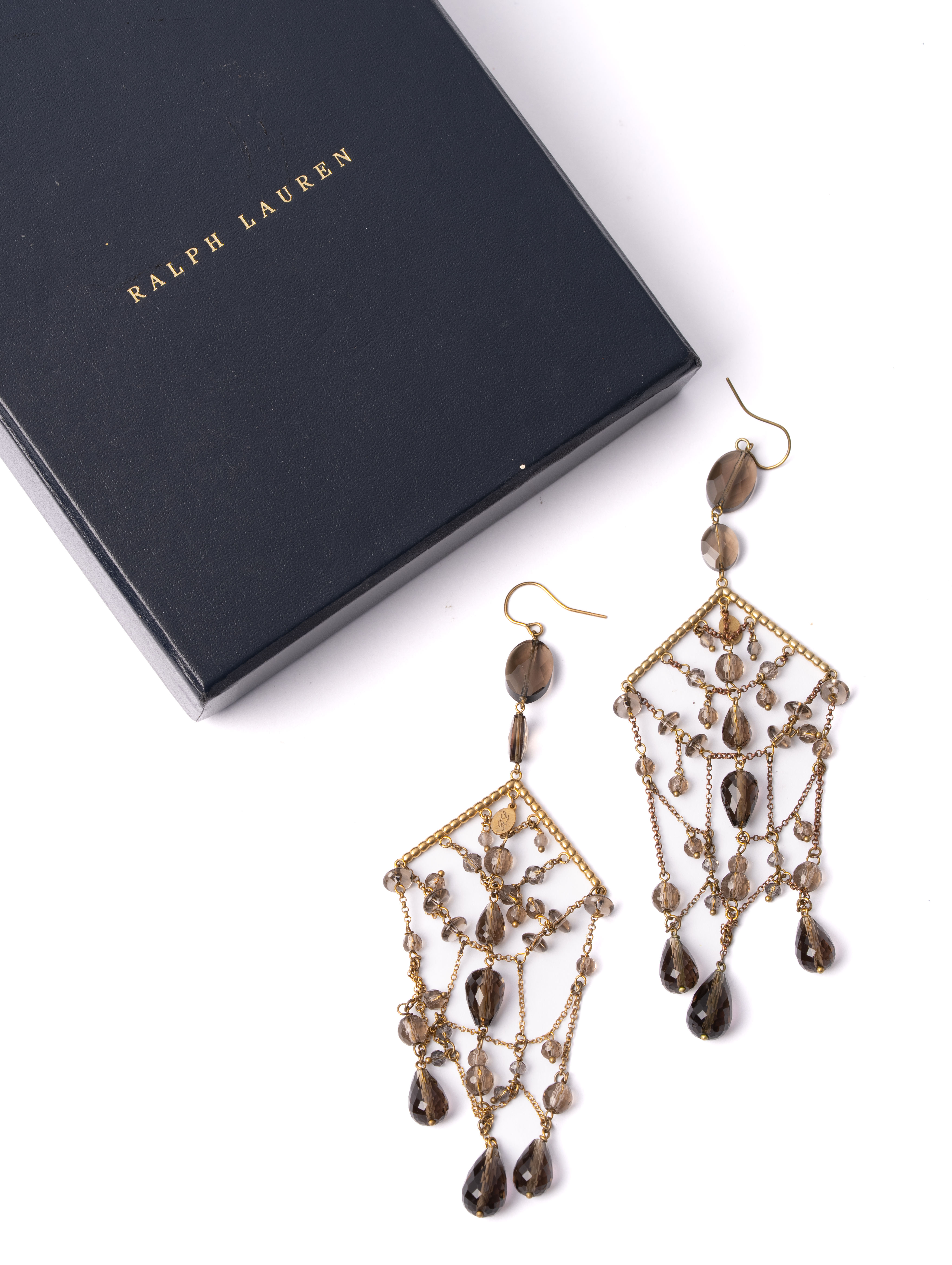 Orecchini chandelier in ottone con cristalli, zirconia cubica e quarzi fumè entro scatola.