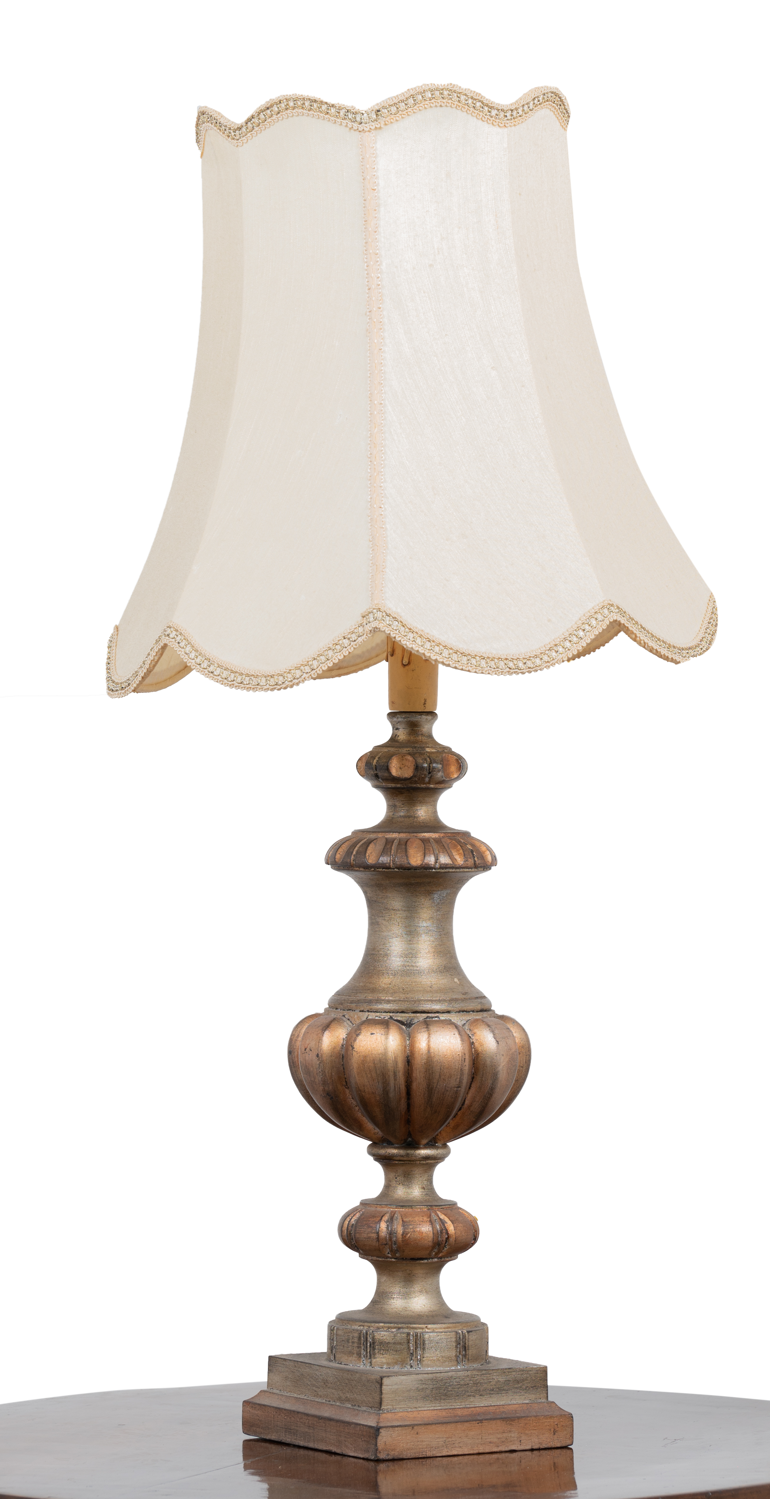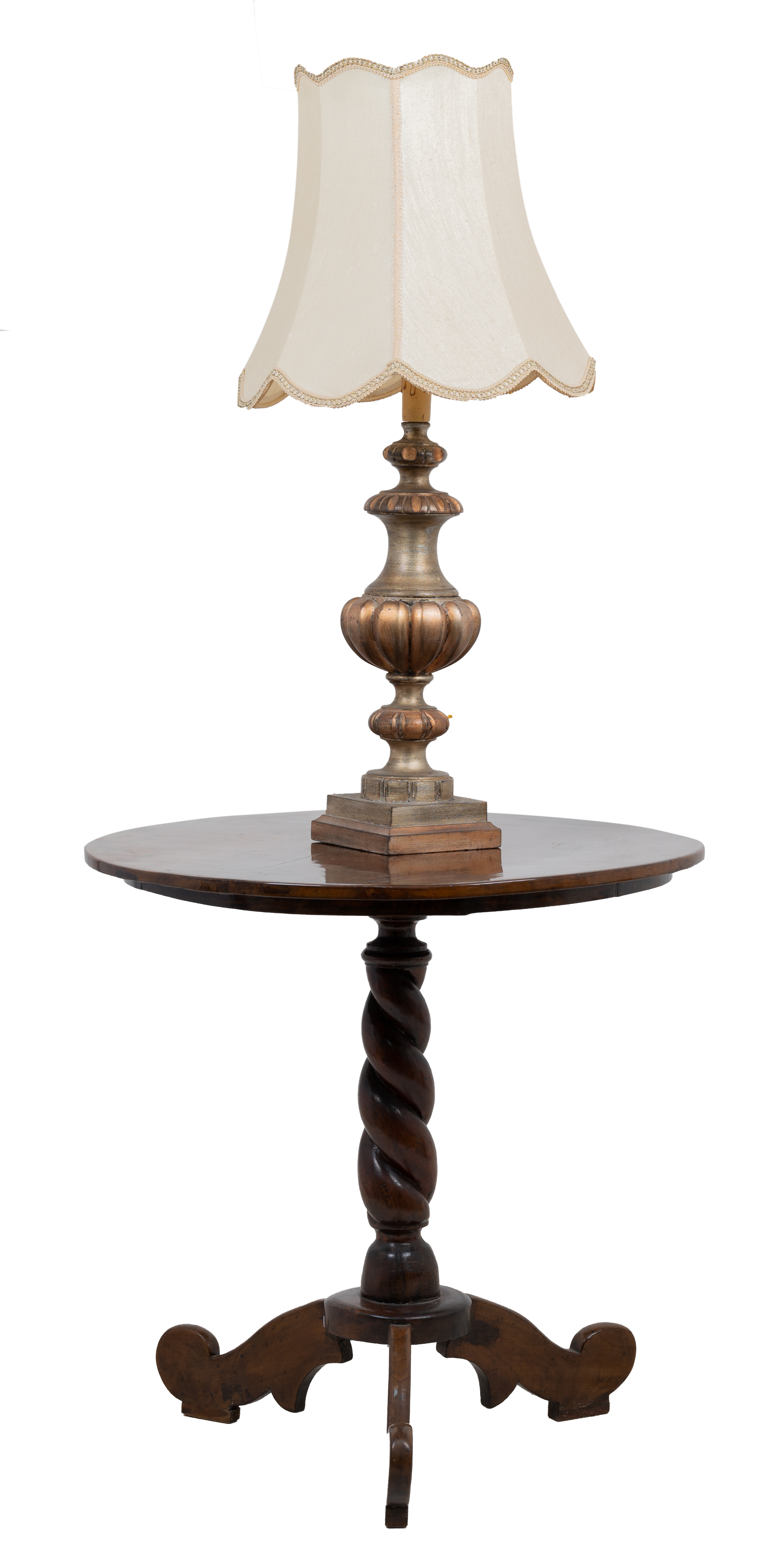 Tavolino in legno di noce e lume in legno argentato e dorato con paralume.