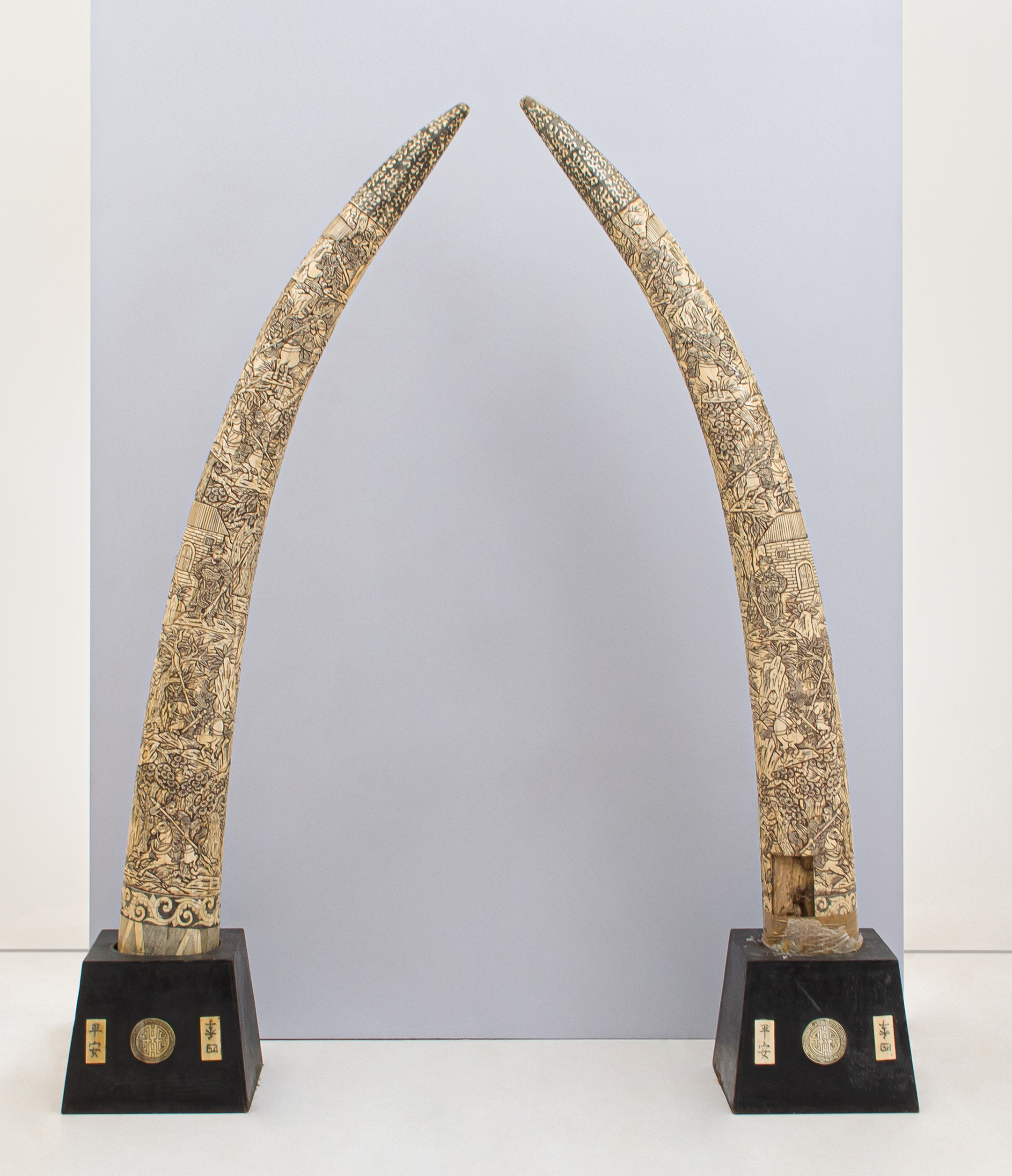 Coppia di zanne di Mammuthus riccamente intagliate raffigurante "Ribellione di Satsuma" con basi in legno (piccole mancanze).