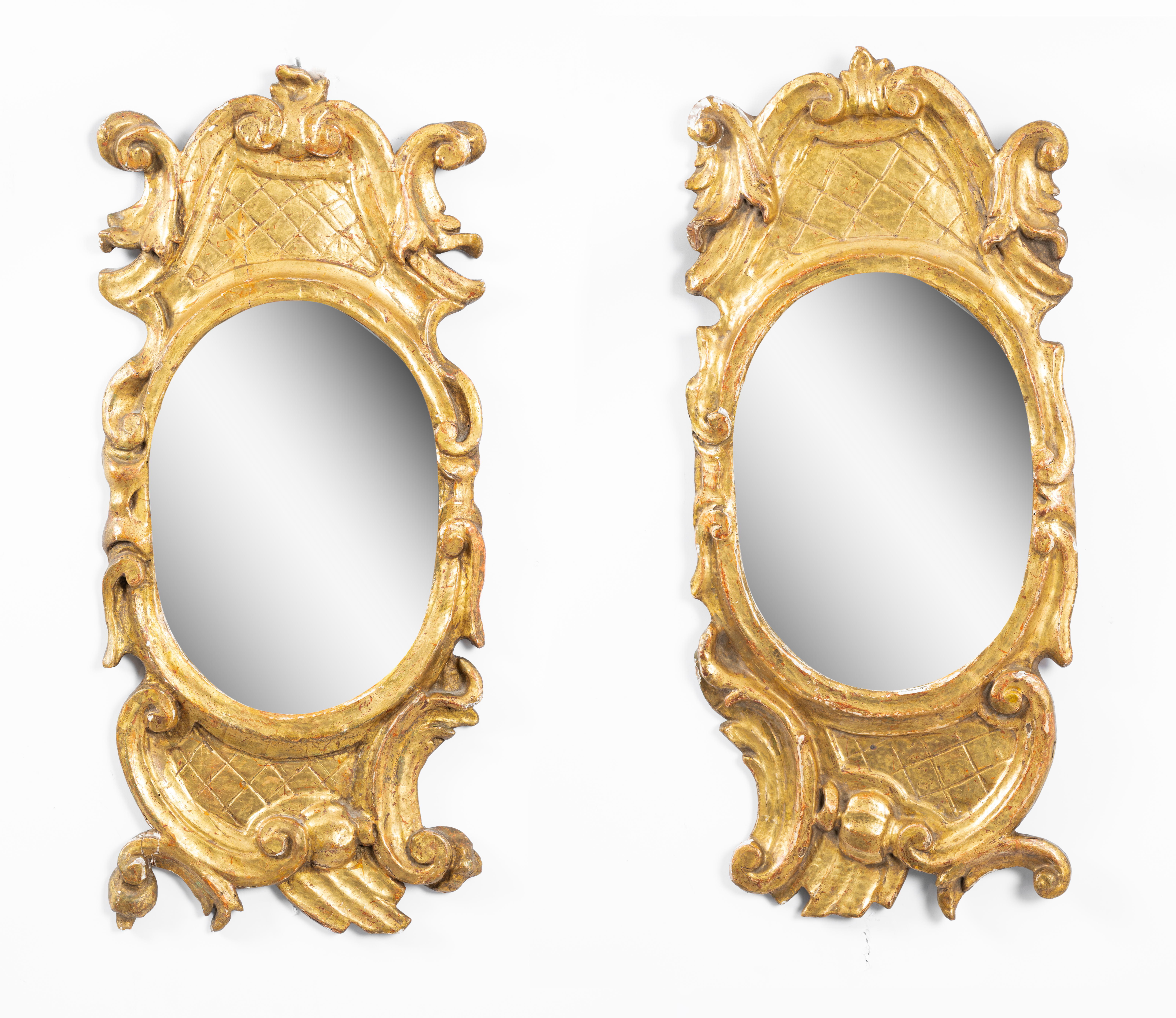 Coppia di piccole specchiere in legno intagliato e dorato ad oro zecchino.