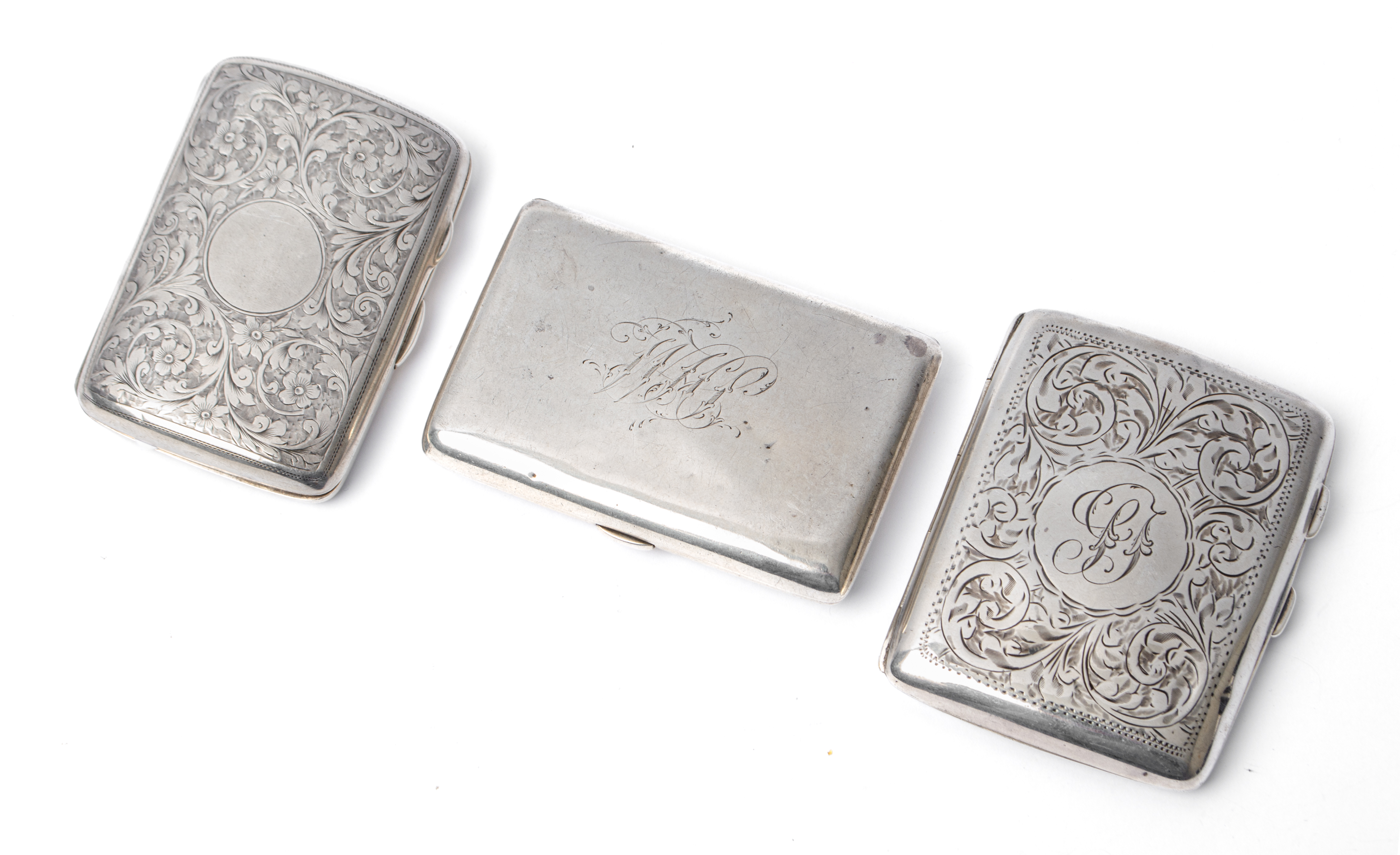 Portasigarette in argento 925 cesellato a motivo floreale e fogliaceo, portasigarette in argento 925 cesellato con monogramma e portasigarette in argento 925 con monogramma (g. 244).