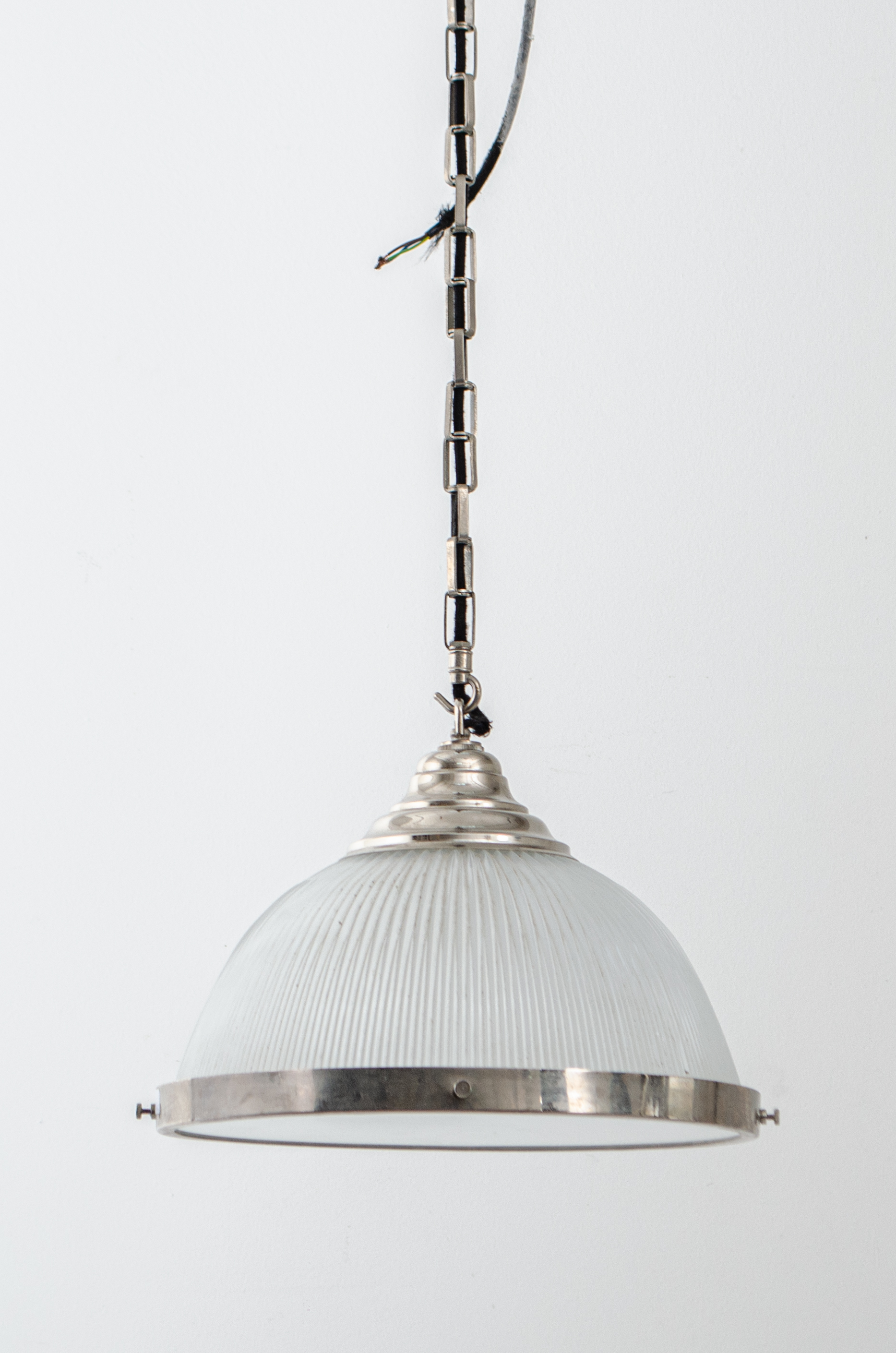 Lampada a sospensione ad una luce, struttura in metallo cromato con diffusore semisferico in vetro satinato e lavorato a stampo con scanalature, catena a maglie rettangolari, vetro circolare satinato.