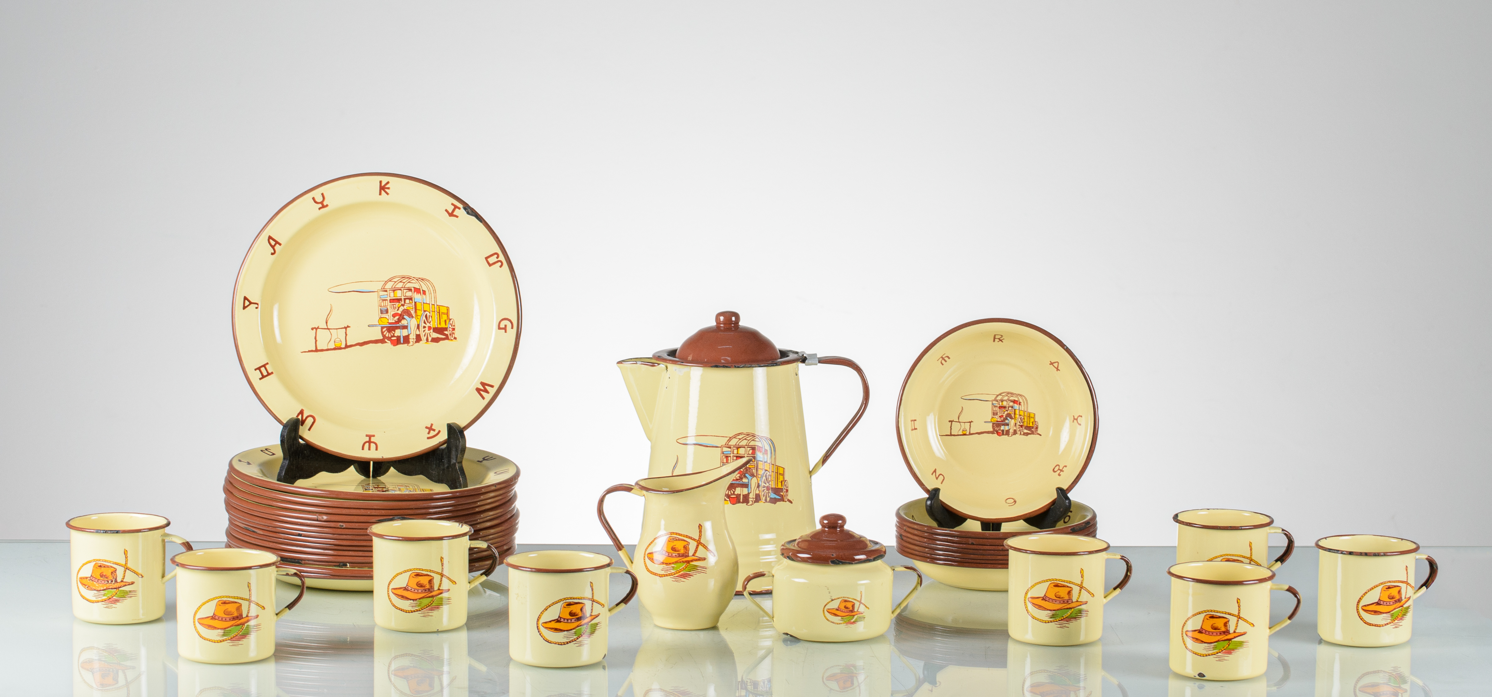 Parte di servizio in latta verniciata gialla e decorata in policromia con motivi “Country” composto da quindici piatti piani, otto tazze, una caffettiera ed una zuccheriera. Difetti. Marchio di produzione.