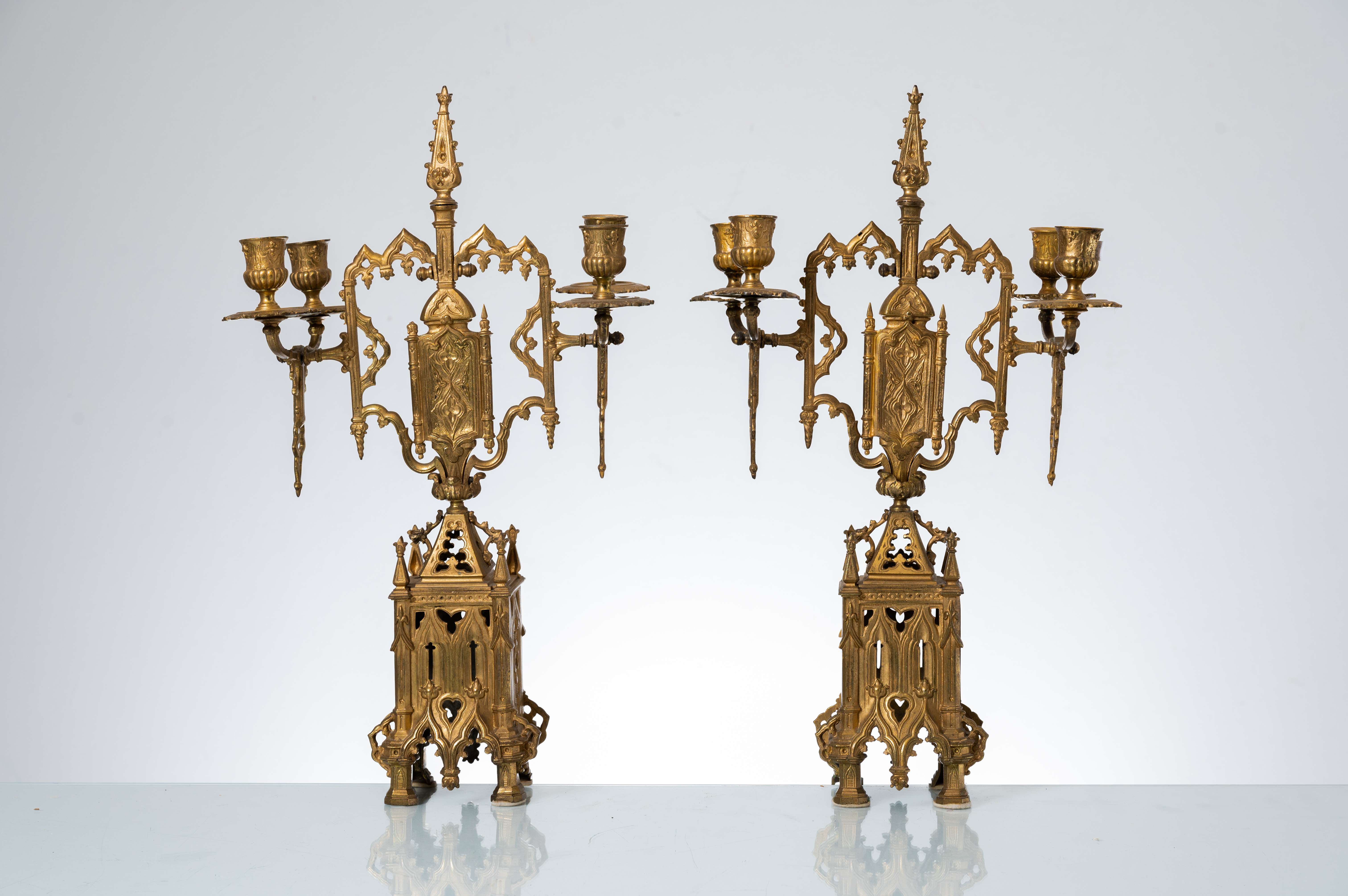 Coppia di candelabri in stile neogotico a quattro fiamme in bronzo.