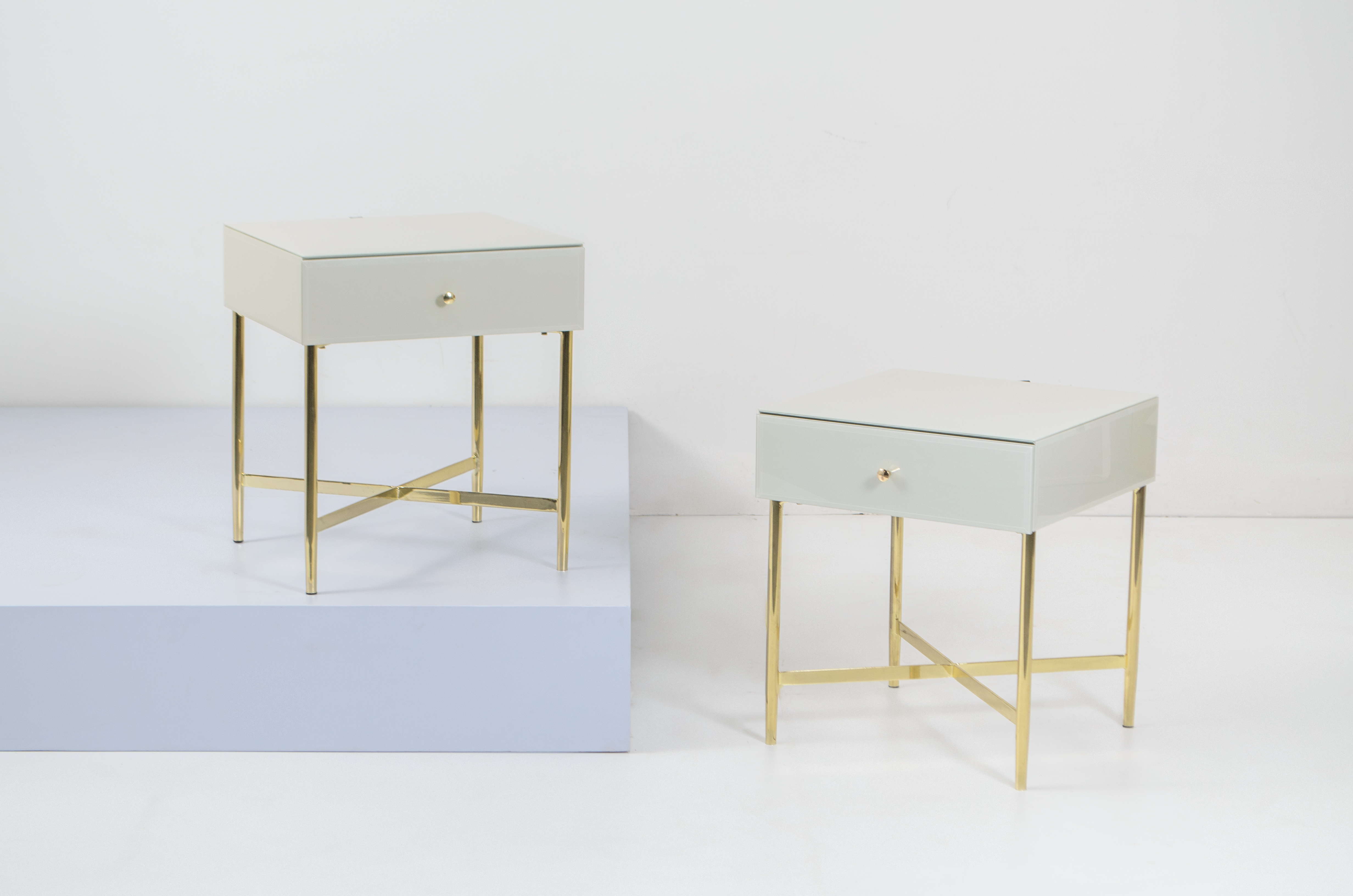 Coppia di comodini con struttura in metallo dorato, corpo superiore in legno laccato bianco, sul fronte un cassetto, minuterie in metallo dorato.