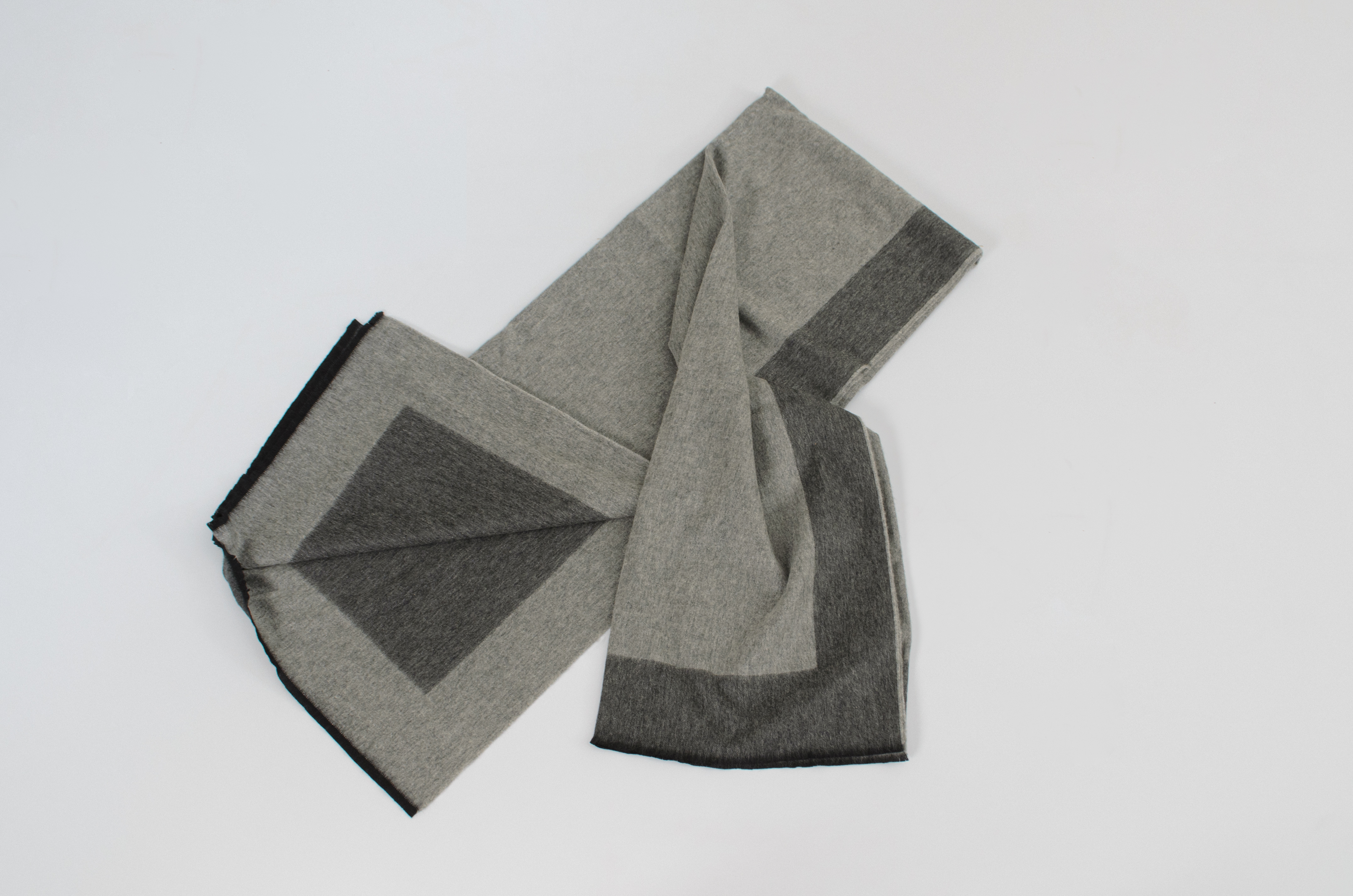 Plaid in puro cashmere modello “Alva Border Duo” nei toni del grigio. Mai usato. Marchio di produzione.