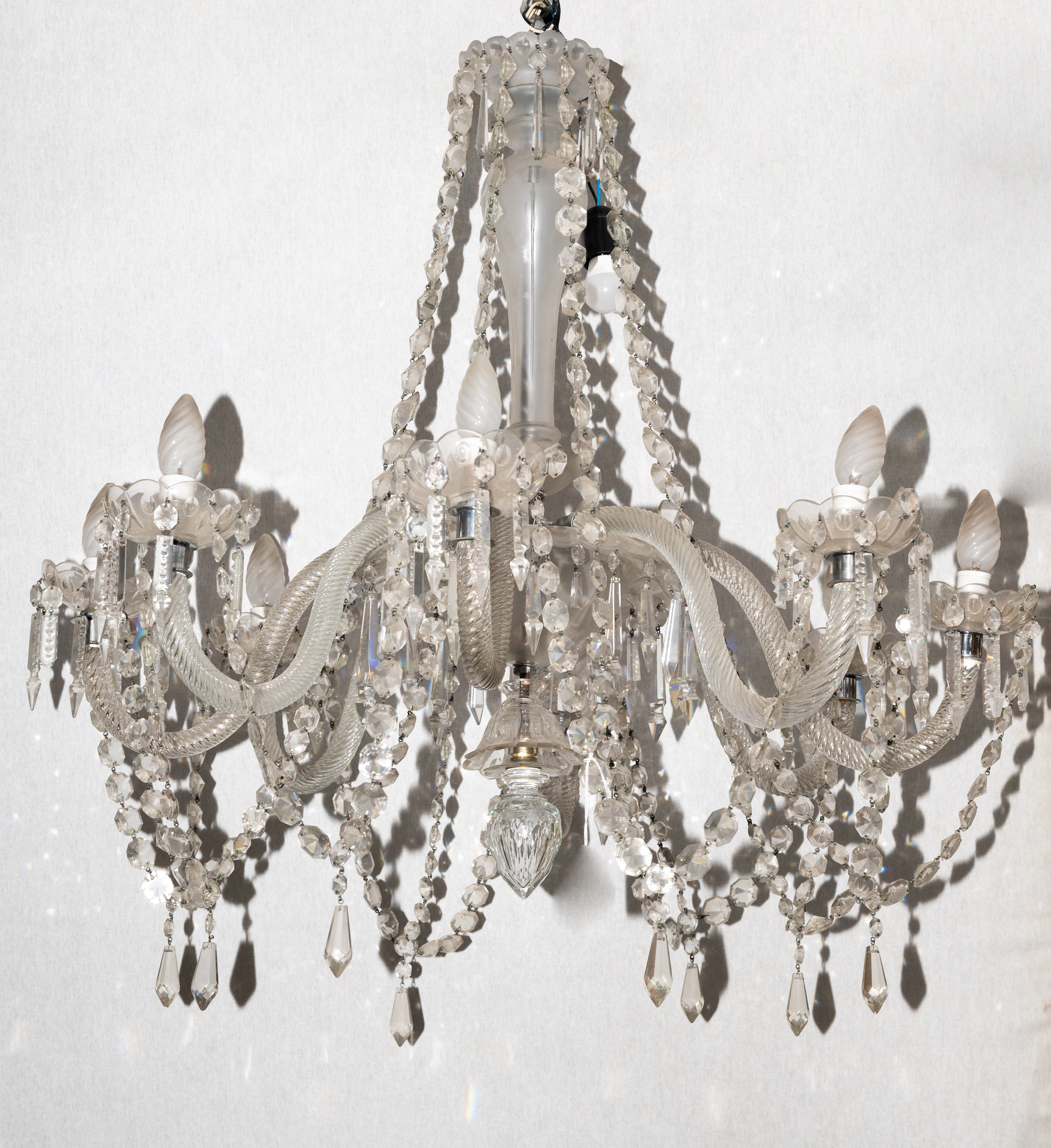Lampadario a otto fiamme in vetro di Murano con catene ad ottagoni e prismi.