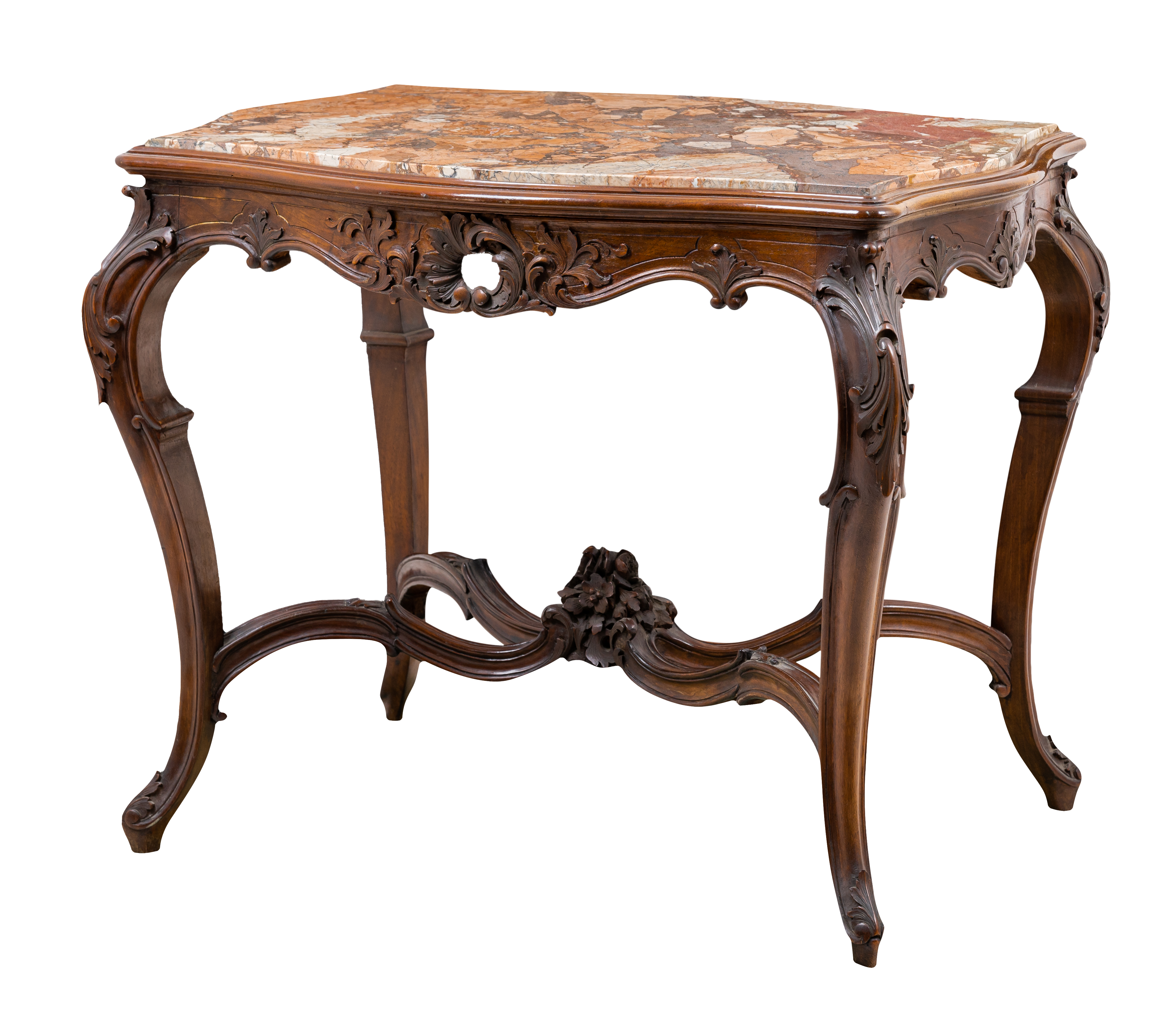 Tavolino di forma sagomata in legno di noce, piano in marmo rosso venato incassato.