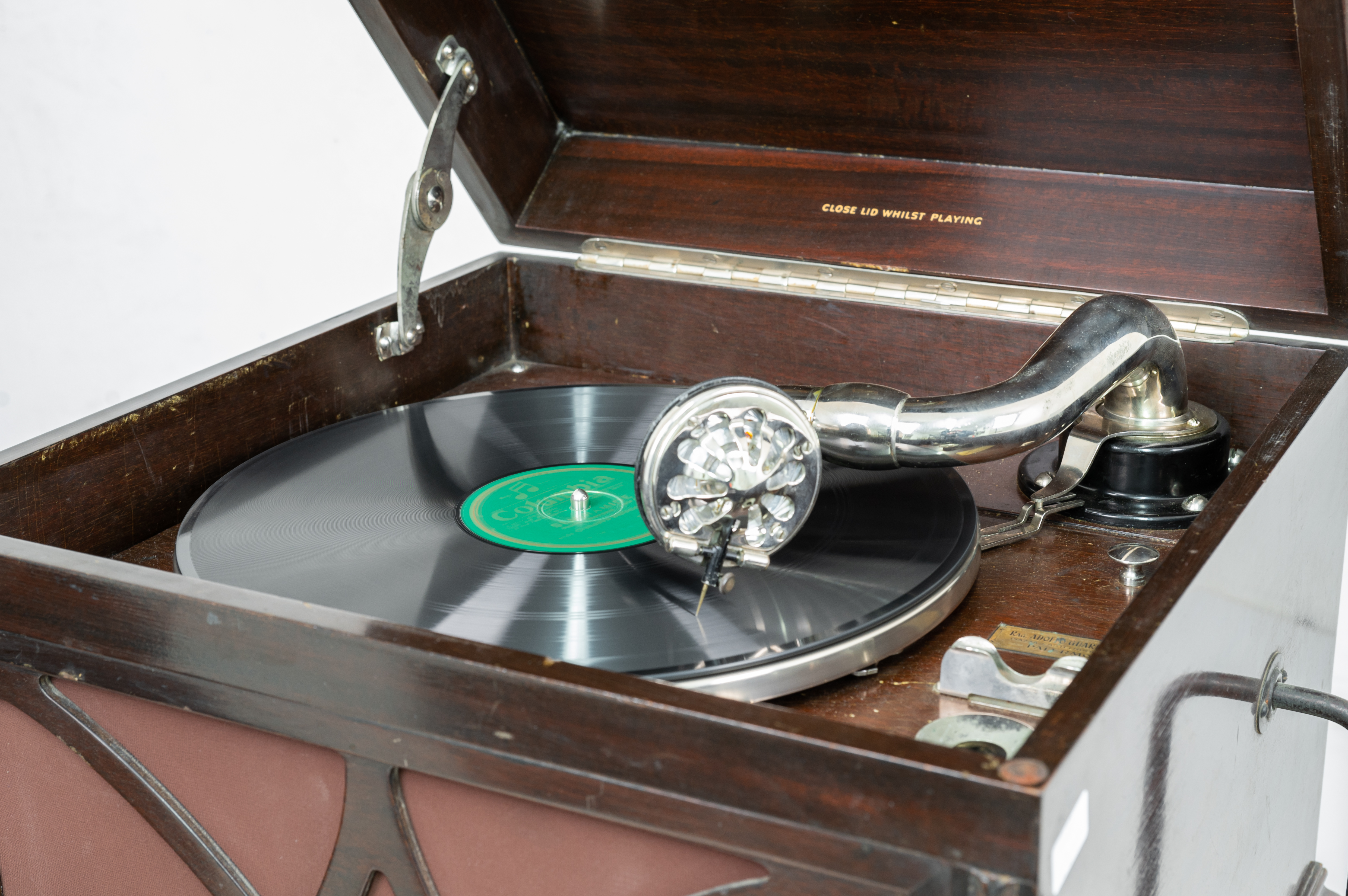 Grammofono "La Voce del Padrone" con cantone in legno di faggio e collezione di dischi in vinile.