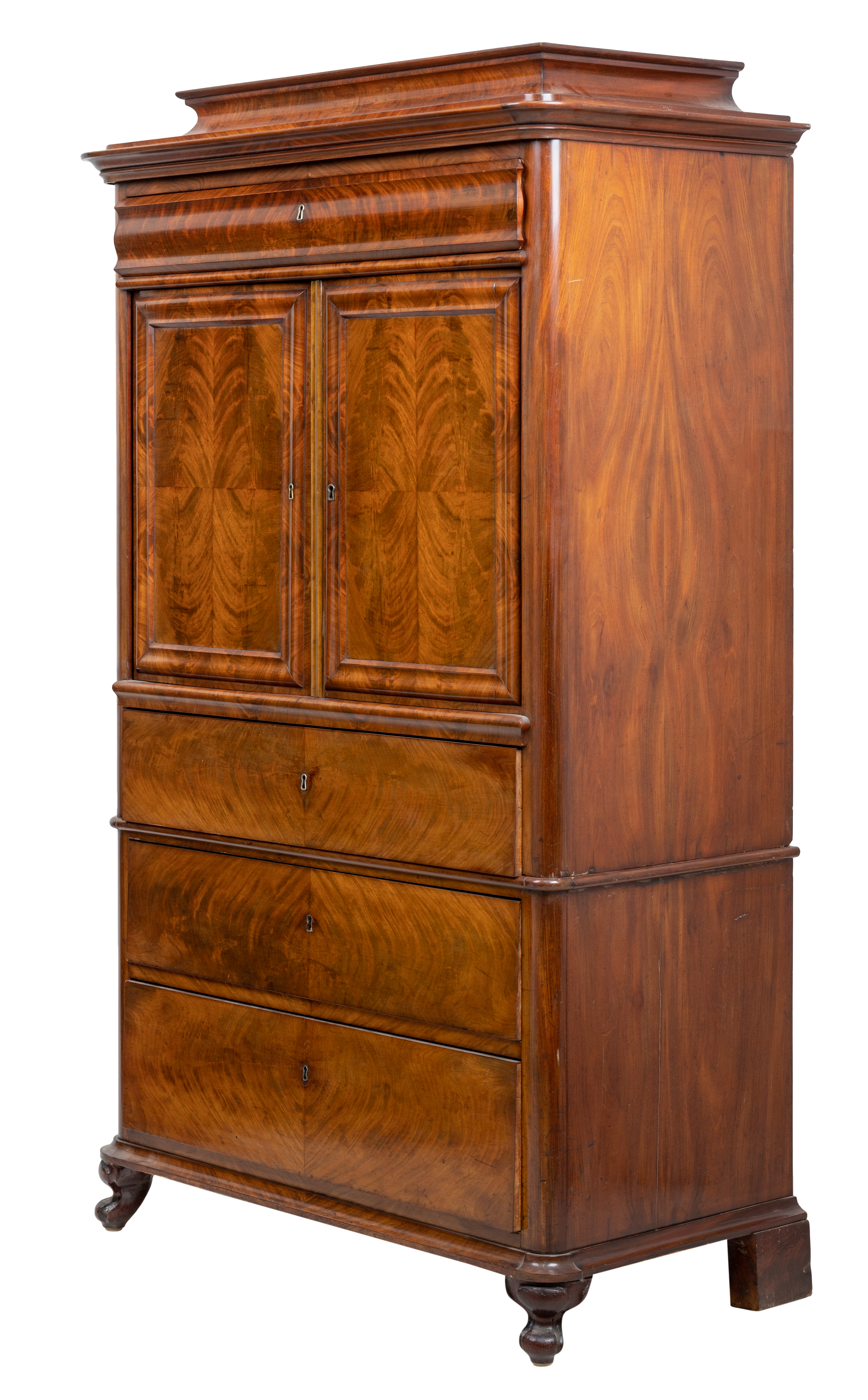 Mobile a doppio corpo con cassettiera nella parte sottostante, due ante nella parte sovrastante in legno di mogano e piuma di mogano.