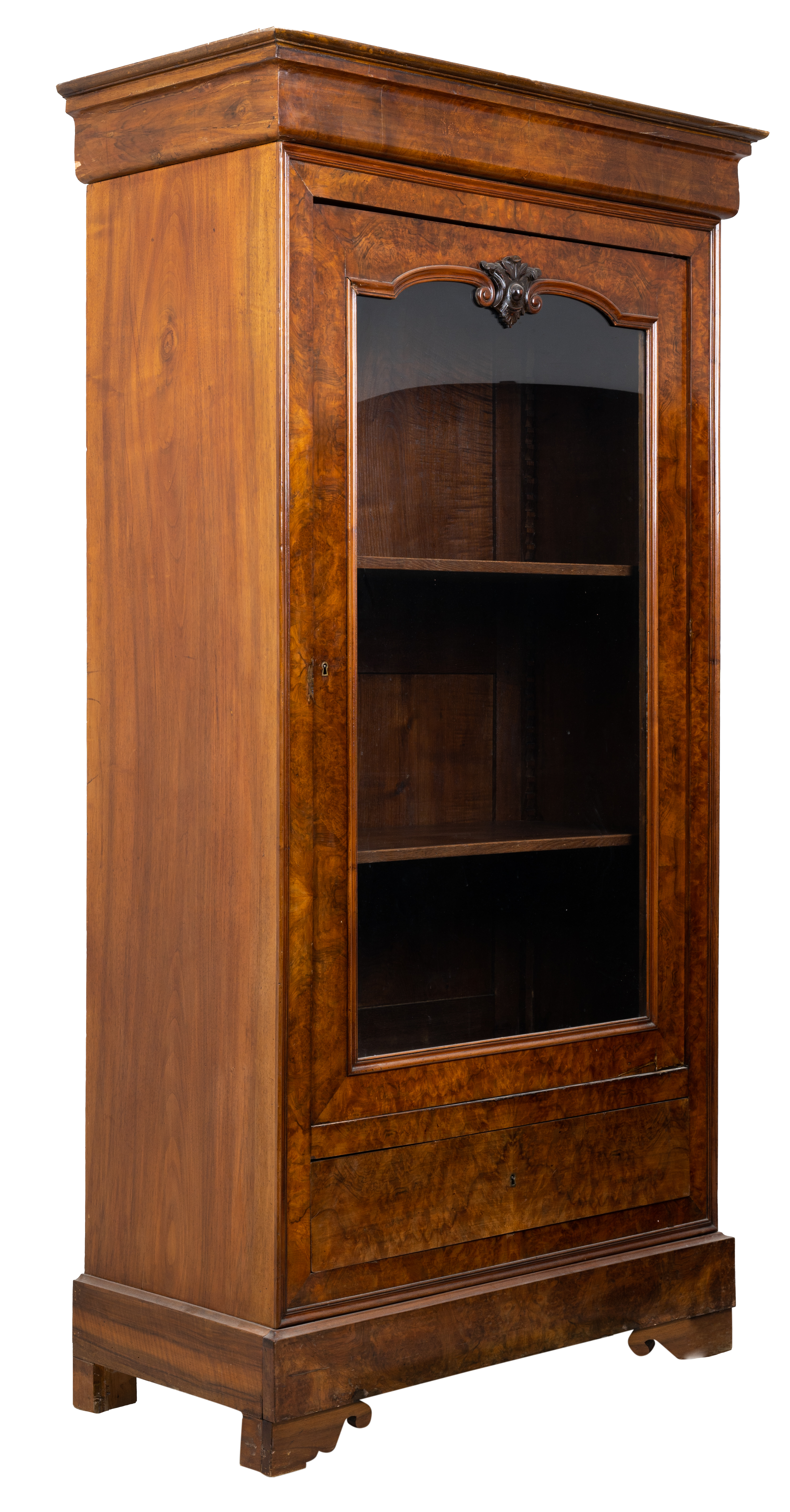 Libreria ad un'anta in legno di noce e radica di noce, due cassetti nella parte sottostante.