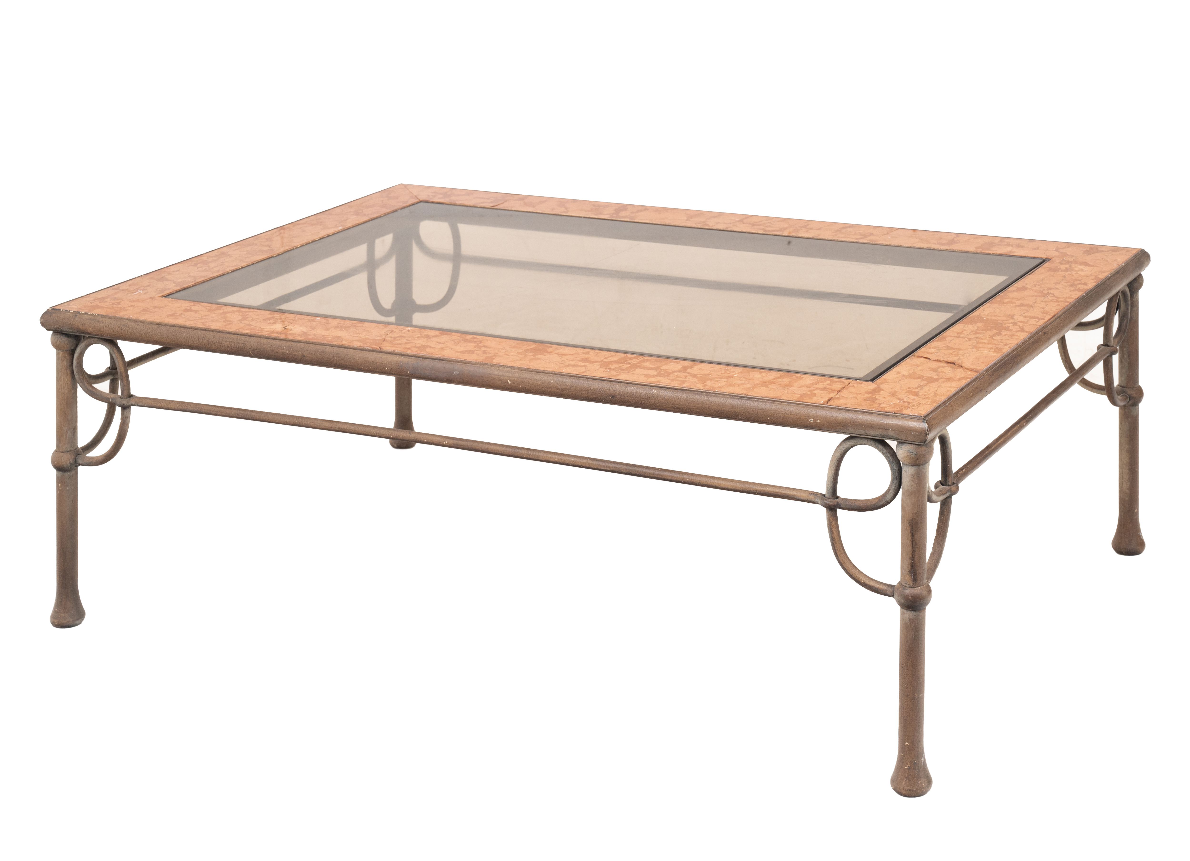 Tavolino da salotto in ferro con piano in parte in marmo rosso di Verona e in vetro.