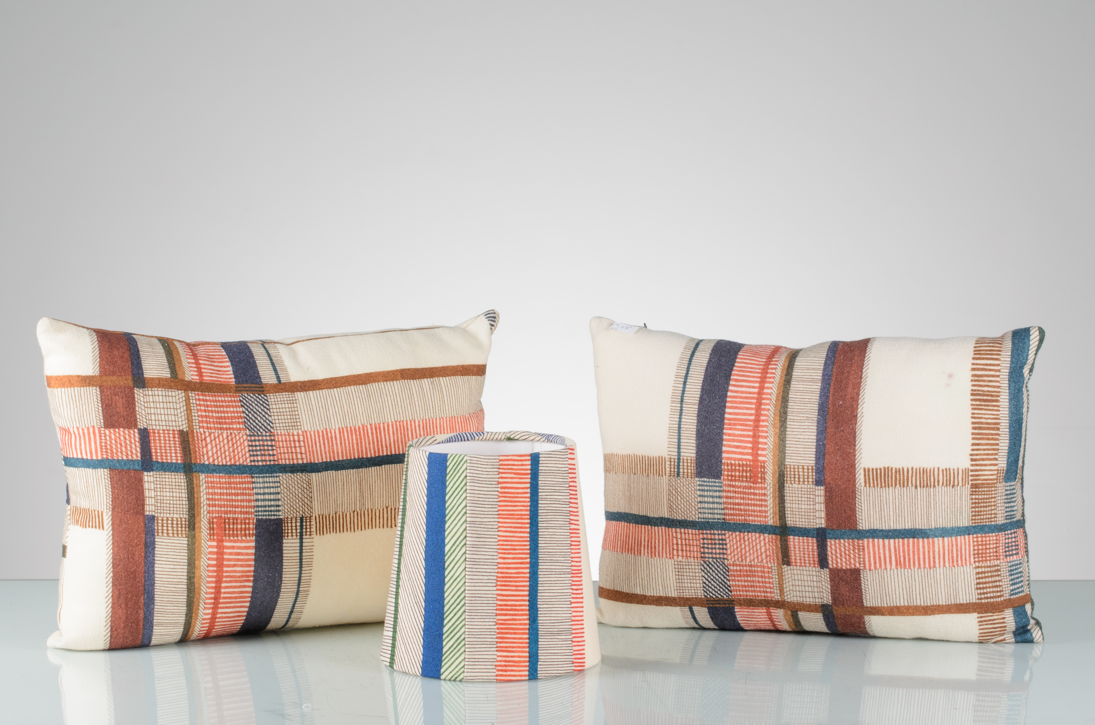 Due cuscini ed un paralume realizzati con tessuto Hermes, cuscini a fondo beige con decori geometrici ad incroci rossi, blu e marroni. Paralume a fondo beige con decori a rigature verticali blu, verse, rosso e marrone. Usure e macchie.