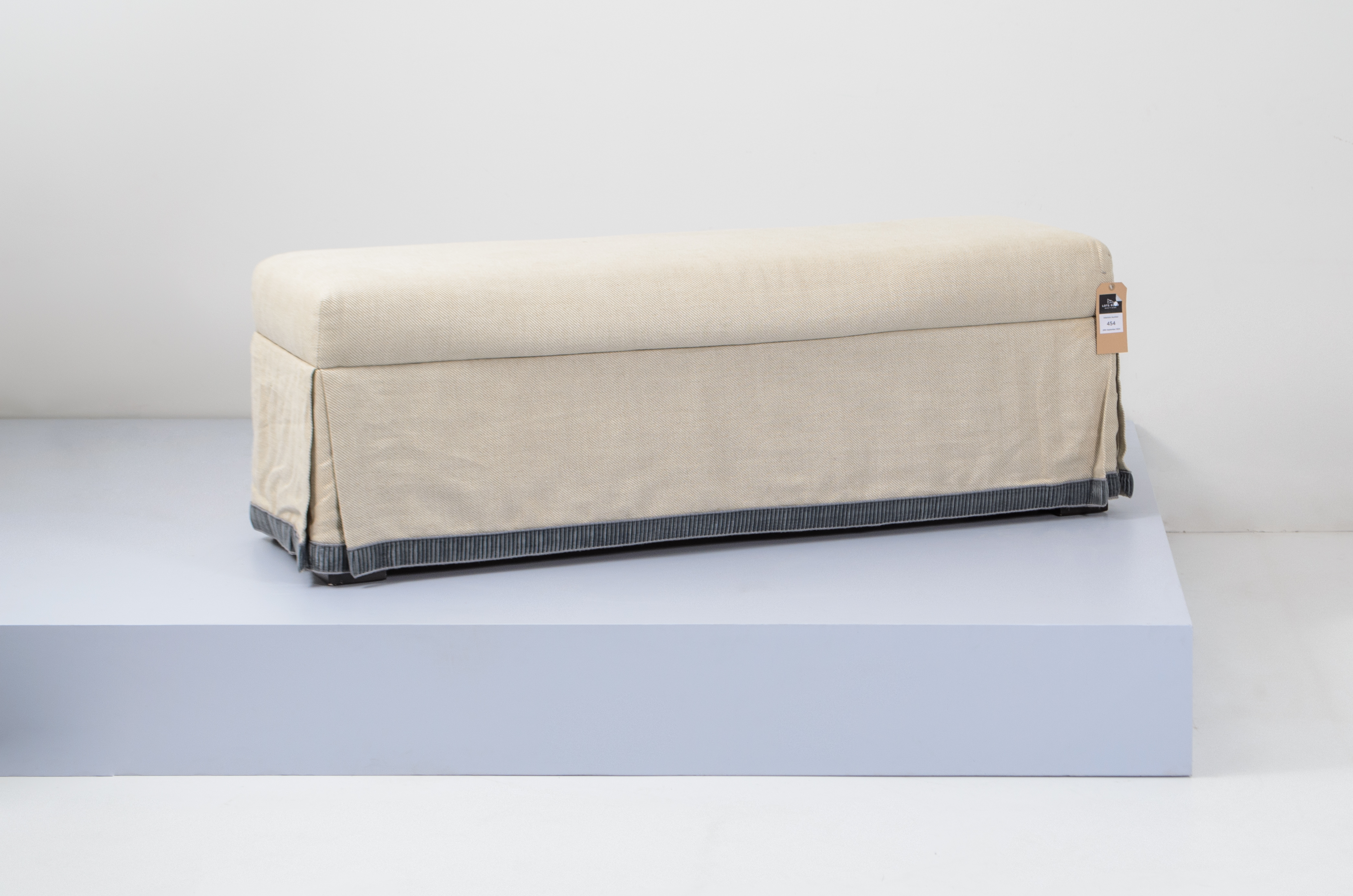 Panca con struttura in legno, imbottitura e sì vestimento con tessuto beige, bordi in velluto nei toni del blu.