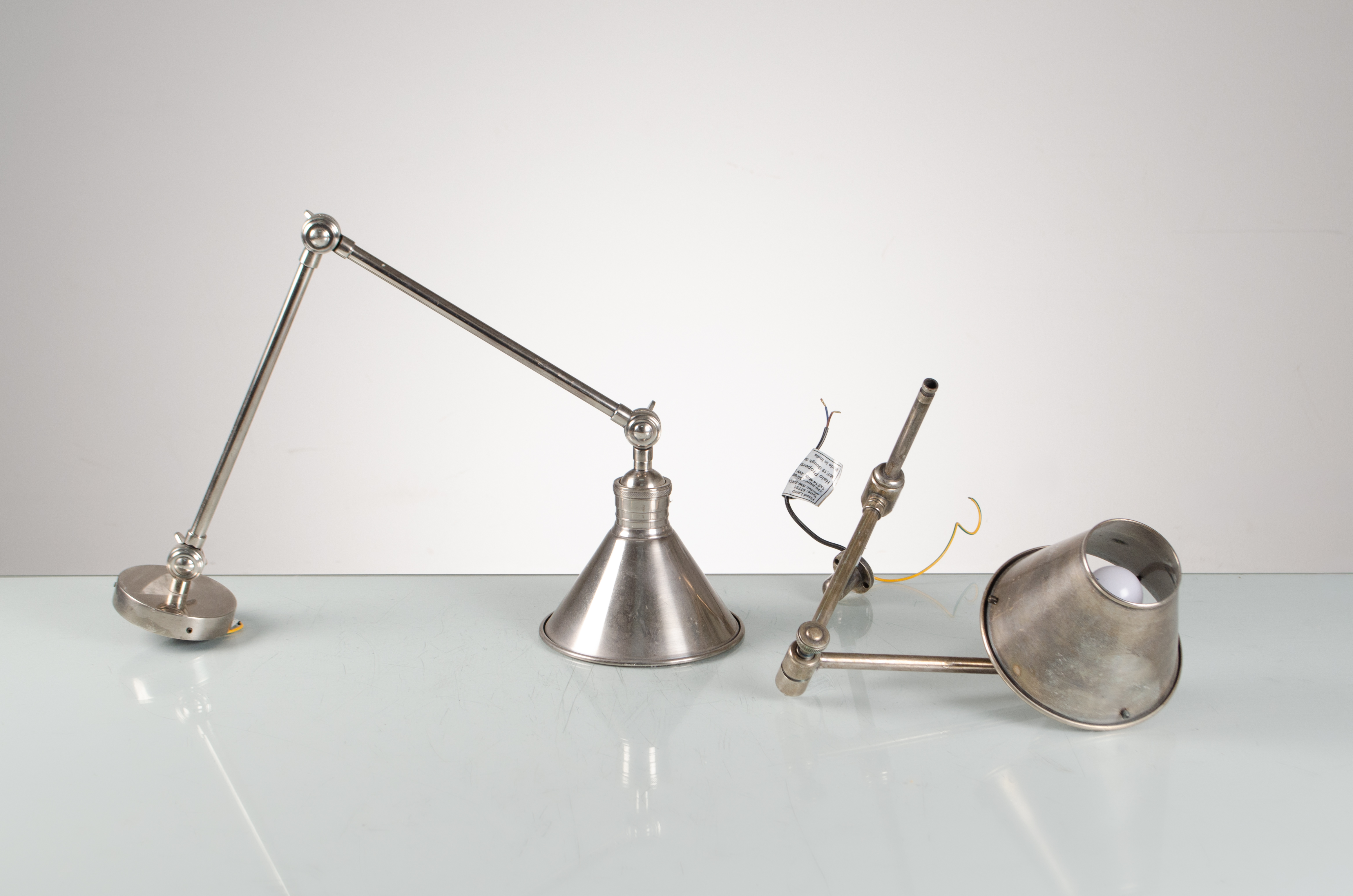 Due lampade da parete ad una luce con struttura in metallo cromato, bracci orientabili, diffusore troncoconico in metallo. Segni di uso e lievi difetti.