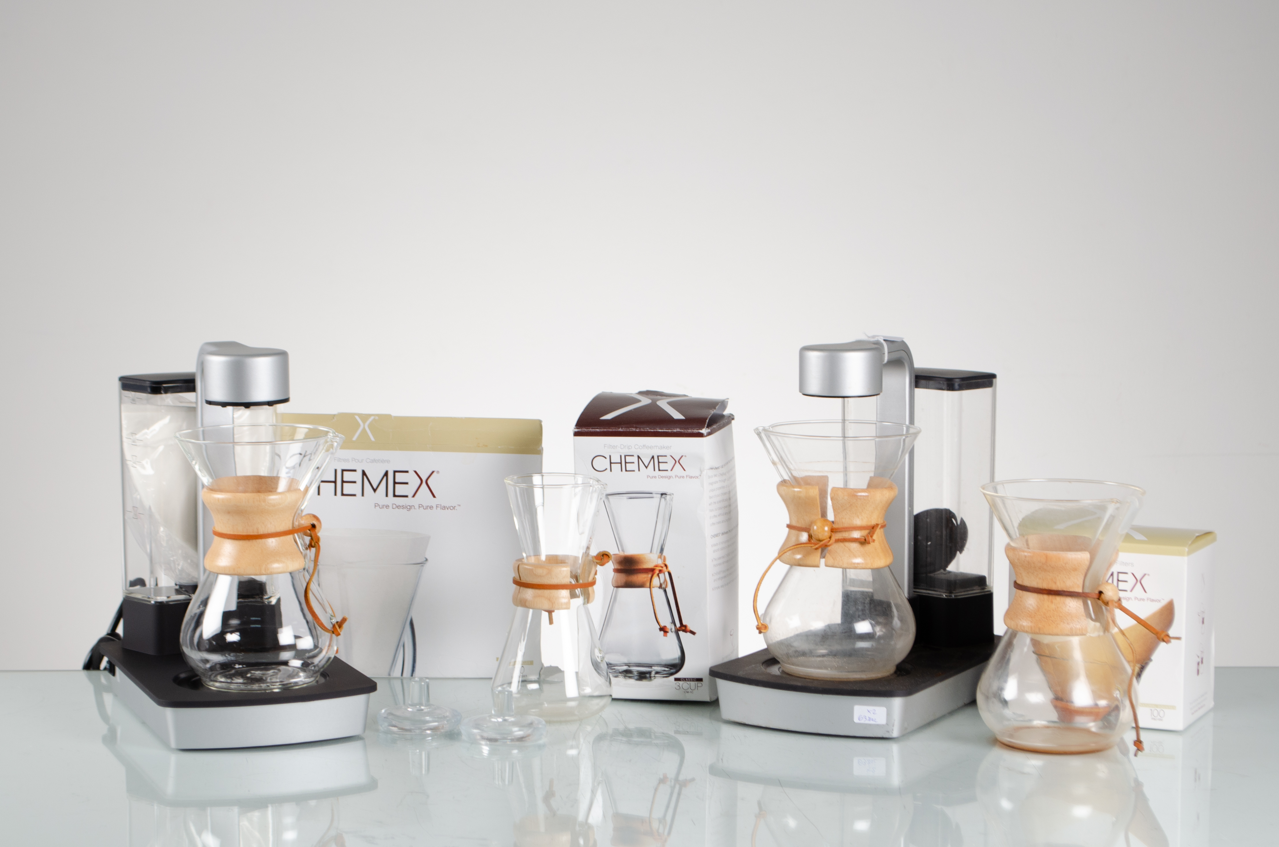 Due caffettiere modello “Ottomatic” con tecnologia testina spray, progettata per la caffettiera CHEMEX con sistema di brewing chiamato “pour-over”, un’estrazione manuale per gravità che avviene versando l’acqua sul macinato attraverso un filtro di carta.
