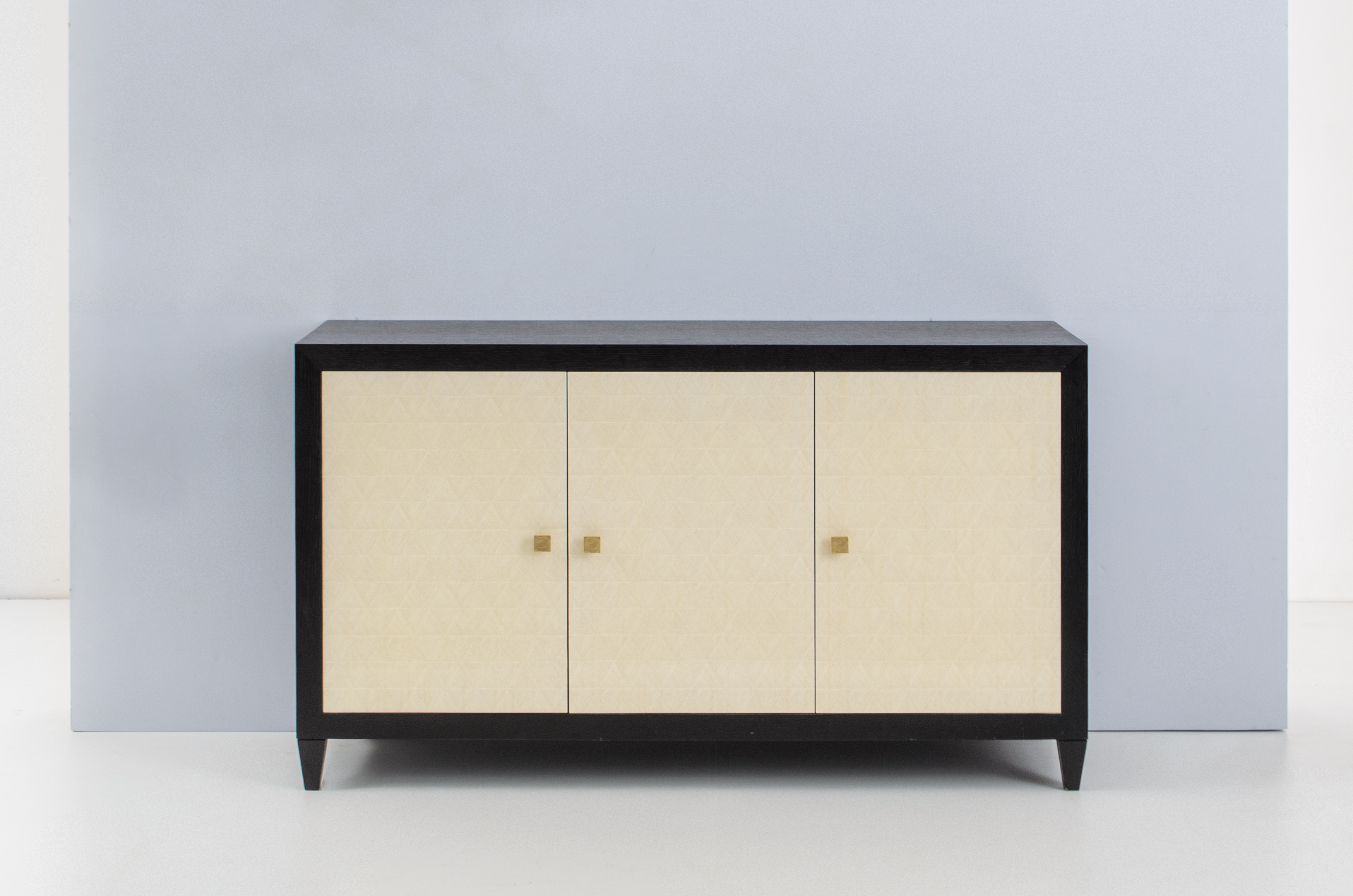 Sideboard in legno ebanizzato, sul fronte tre sportelli con chiusura a battente in legno con decoro geometrico su fondo avorio, ripiano interno.