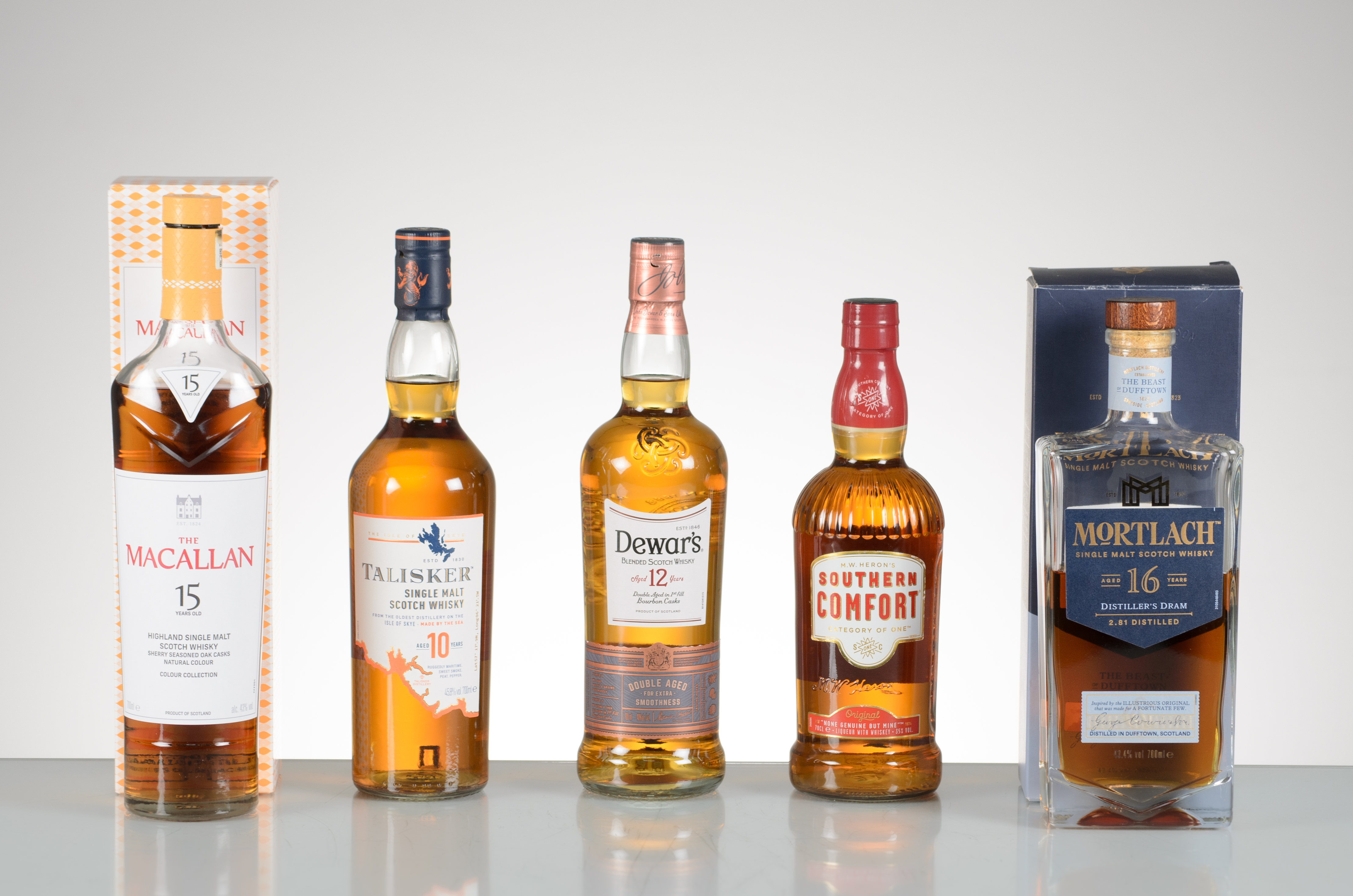 MACALLAN, TALISKER, DEWAR’S, HERON’S, MORTLACH., 5 bottiglie whisky
