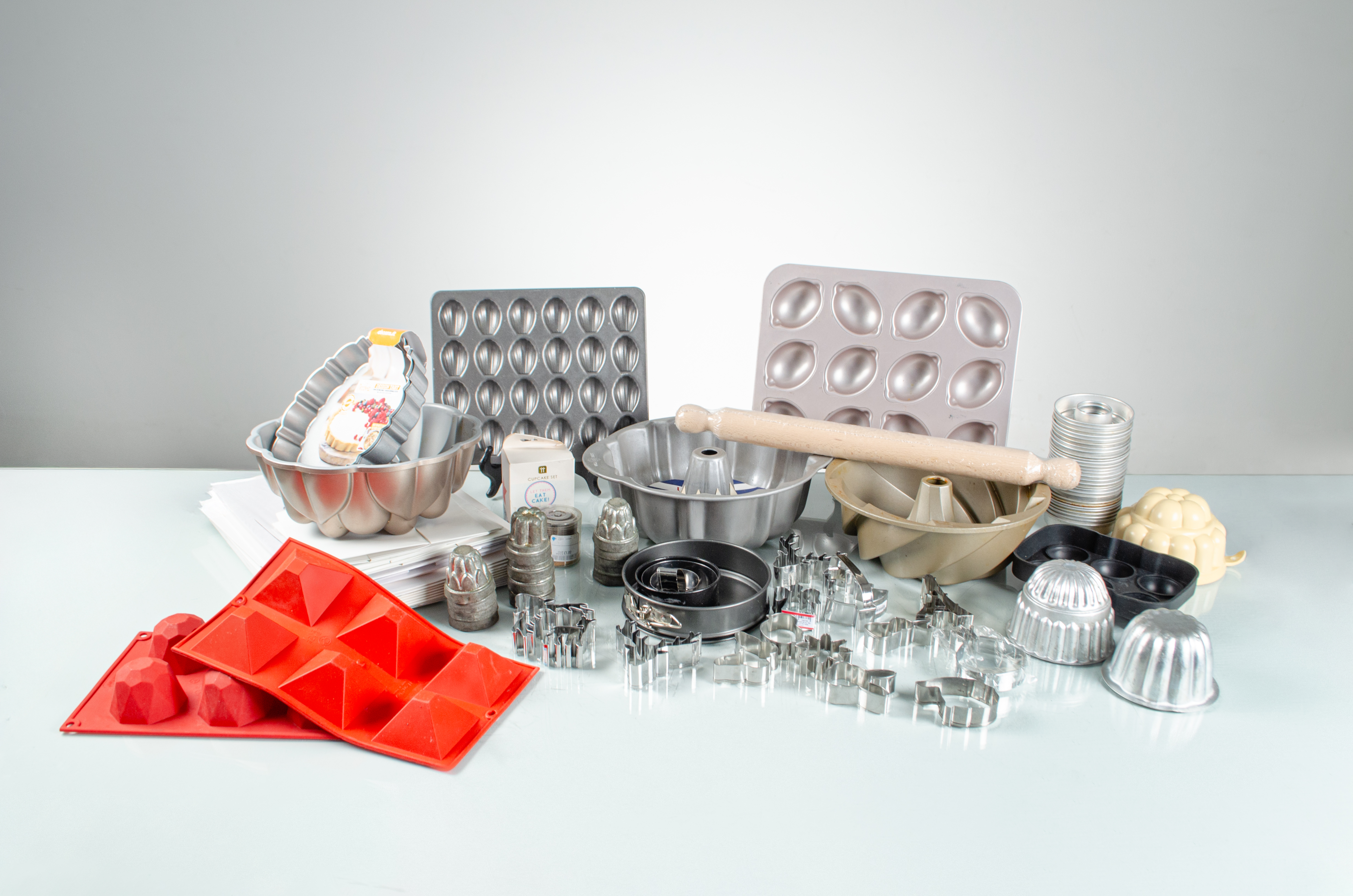 Settanta utensili da cucina così suddivisi: 29 stampi in metallo con foro centrale, 15 formine per biscotto in metallo, 3 anelli coppa pasta in metallo, 1 teglia piccola rotonda in metallo, 1 mattarello in legno, 3 stampi in silicone, 2 stampi in metallo per biscotti, 13 stampi in metallo per budino, 2 stampi in alluminio per budino, 3 stampi grandi con buco centrale, 1 stampo per gelatine in silicone, 2 teglie in metallo per crostate, 2 confezioni di porottini in carta, tre confezioni di box di carta per dolci.