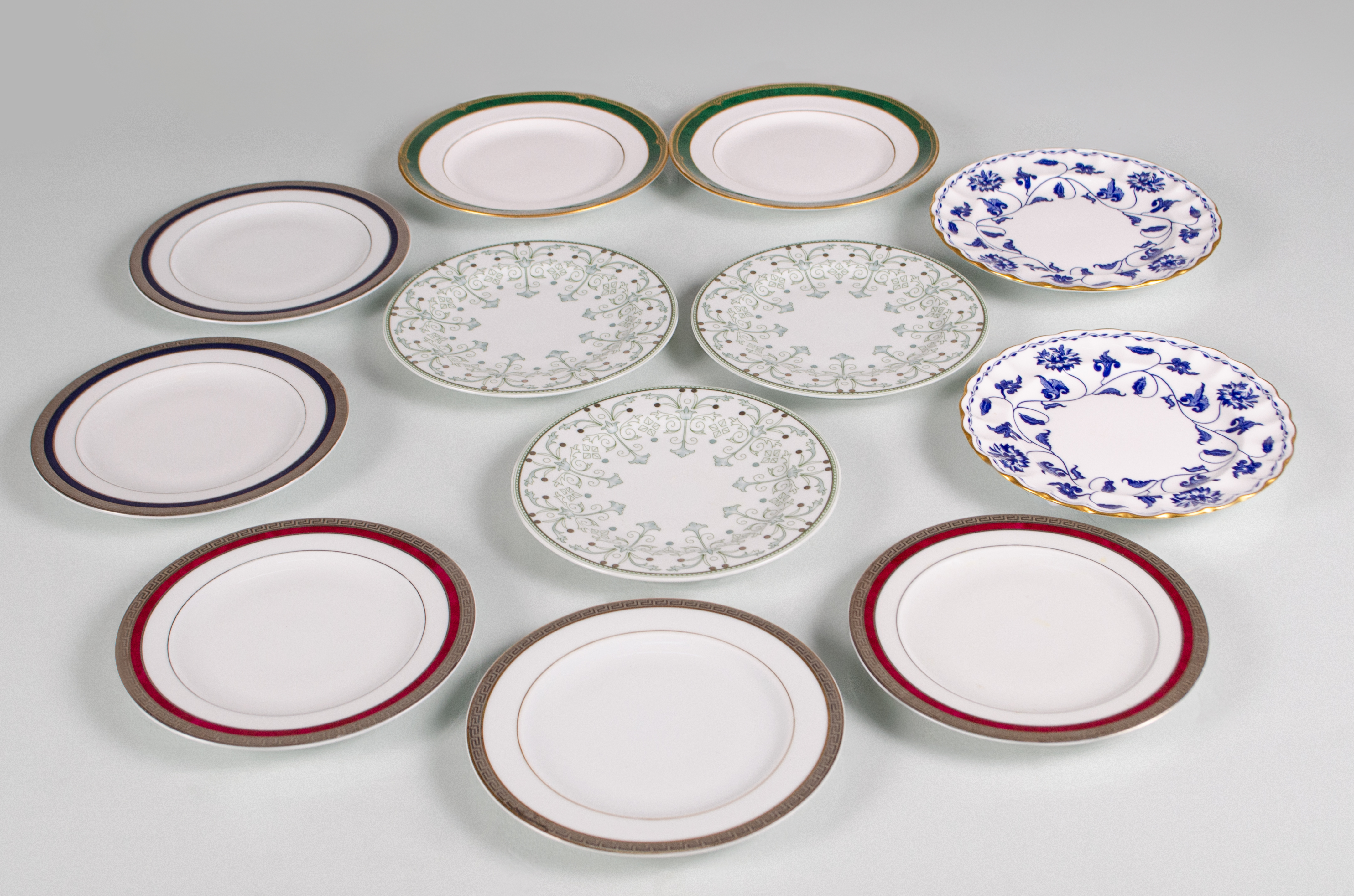 Dodici piattini da dessert in porcellana bianca con differenti decori policromi, alcuni con bordo in oro e argento. Marchio di produzione.