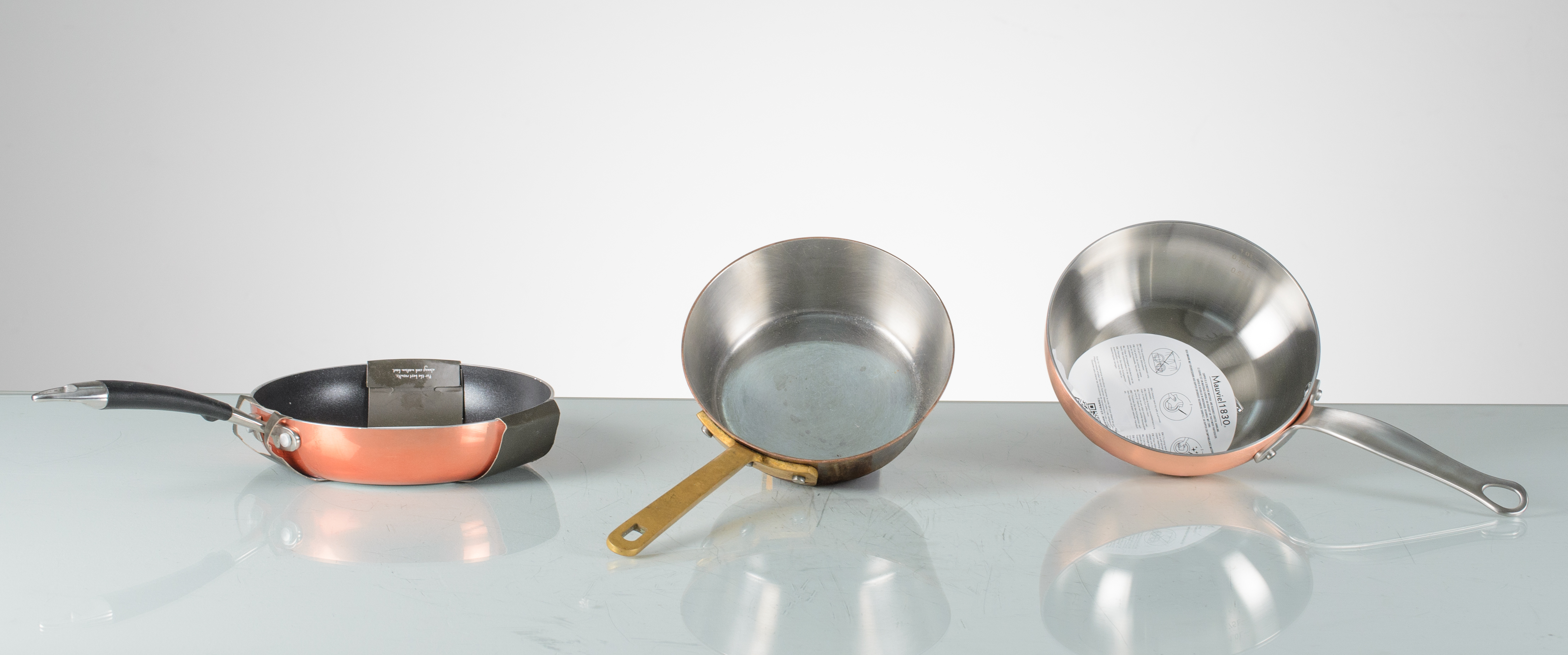Una padella antiaderente con rivestimento in rame; una casseruola in rame e metallo argentato; un pentolino in rame e metallo argentato. Marchio di produzione.