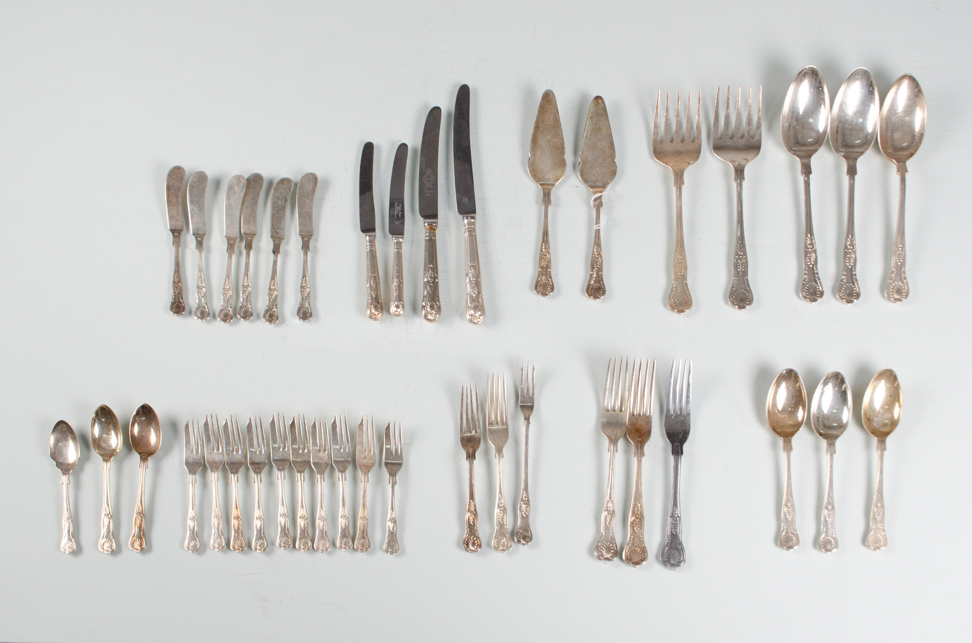 Parte di servizio posate in sheffield modello “Kings” composto da dieci forchette dolce, sei coltelli dolce, due palette, un cucchiaio per salsa, due forchette da portata per pesce, tre cucchiai da portata, due forchette da portata, tre cucchiai, due cucchiai da dessert, quattro forchette, due coltelli, due coltelli frutta. Punzoni.