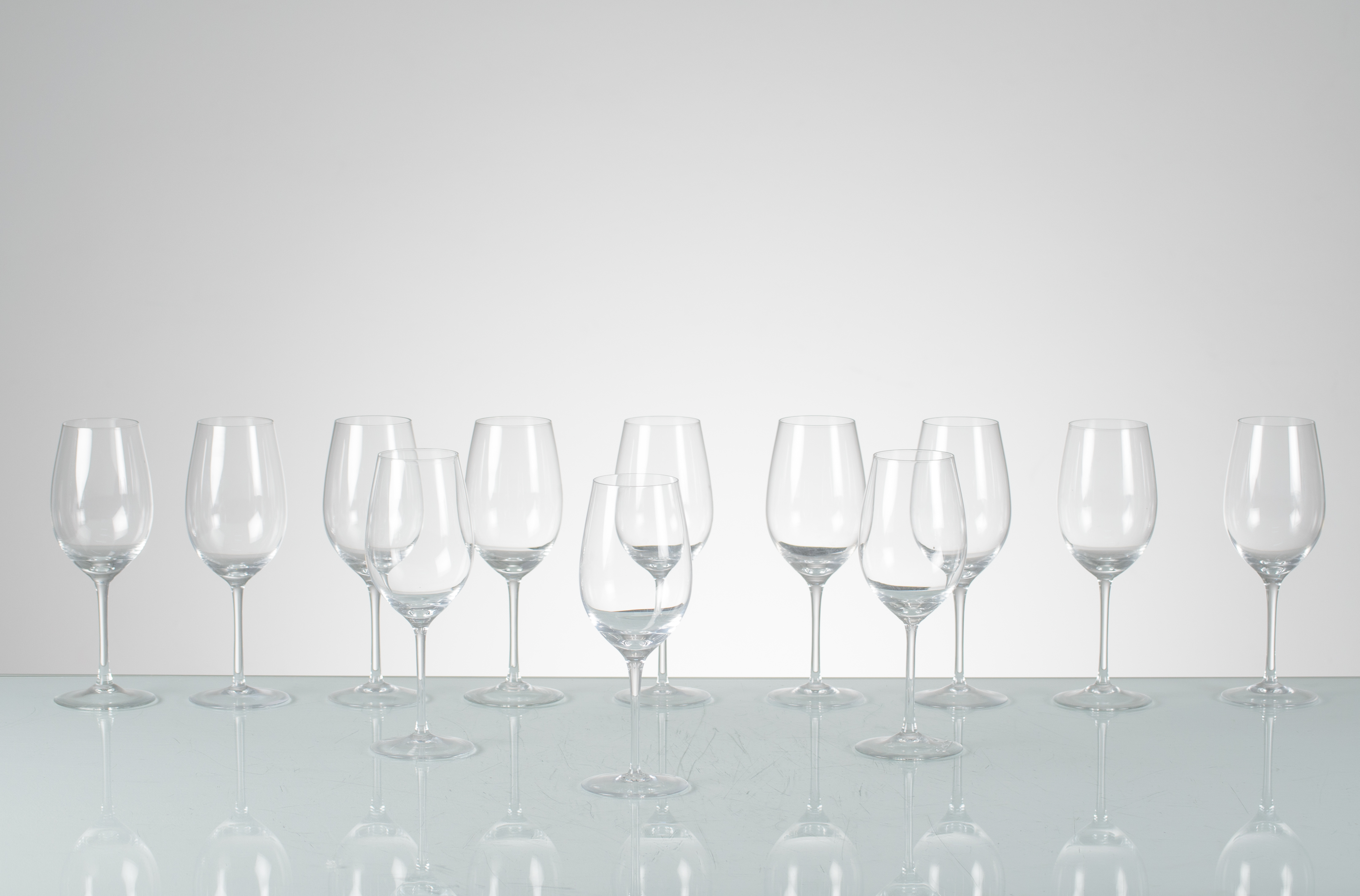 Dodici calici da vino in cristallo trasparente. Marchio di produzione.