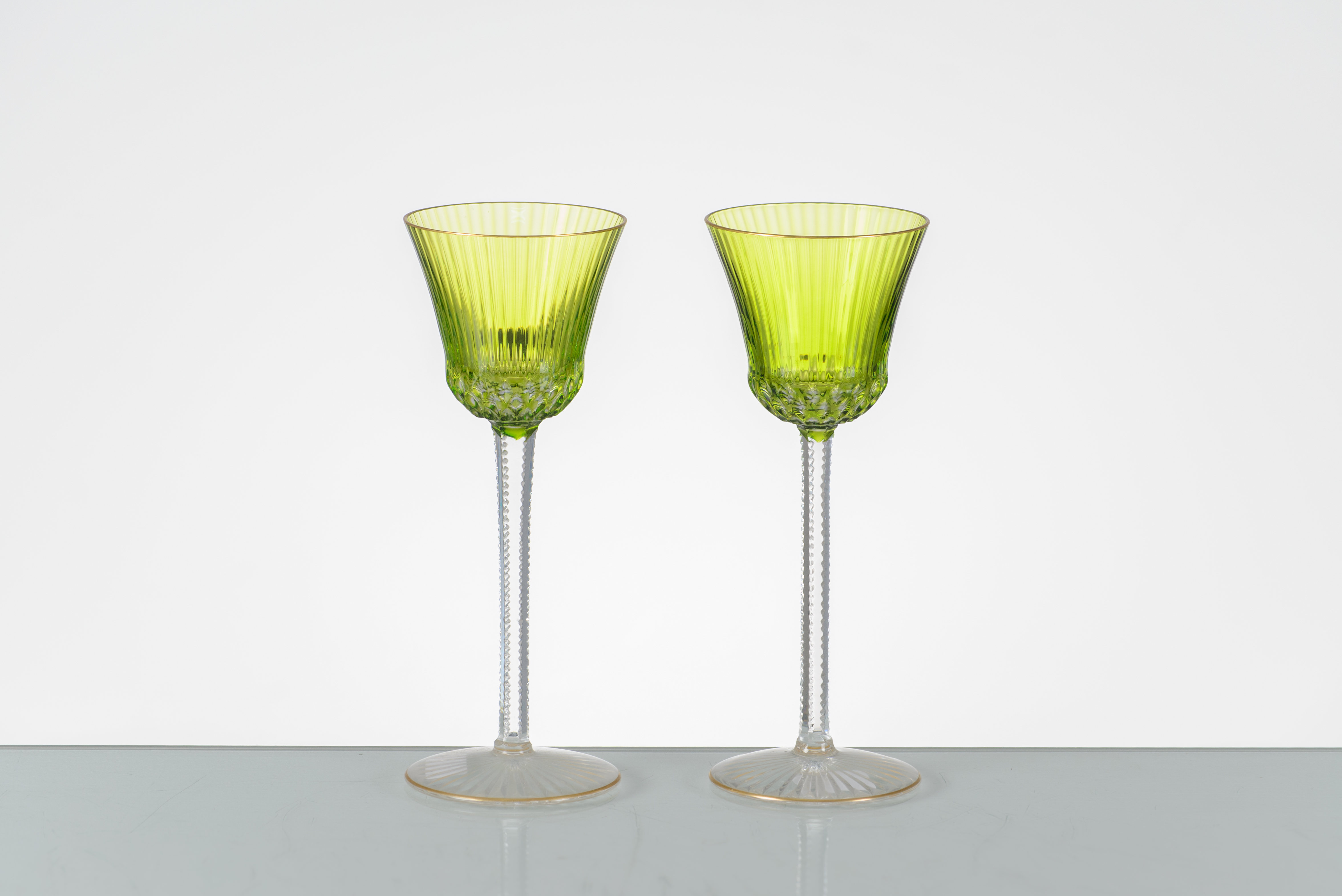 Due bicchieri Roemer modello “Apollo” in cristallo verde tagliato interamente a mano con un taglio brillante. Marchio di produzione.