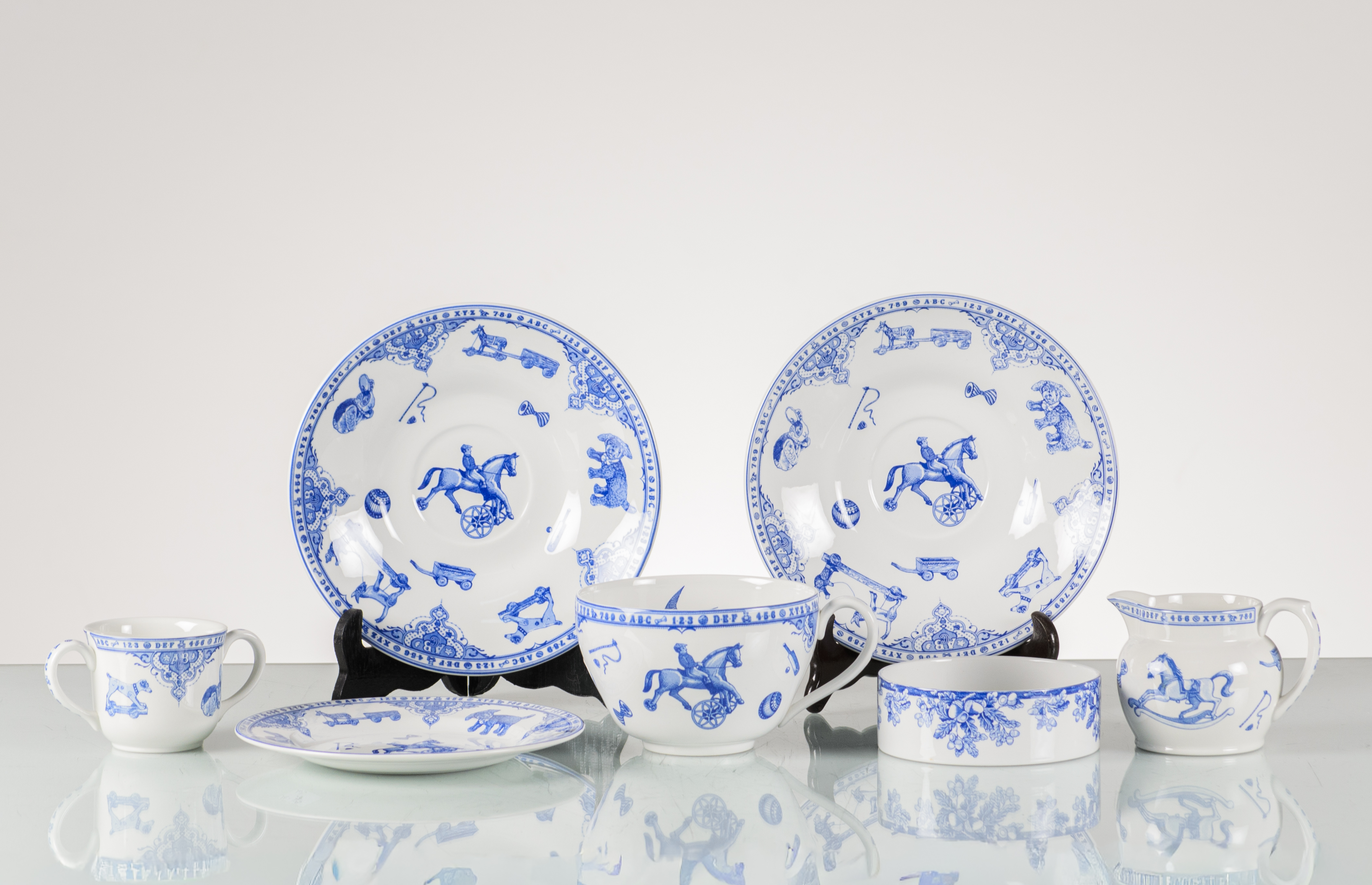 Servizio colazione in ceramica bianca con decori blu composto da sette pezzi: tre piatti, una tazza, una zuccheriera, una lattiera. Marchio di produzione.