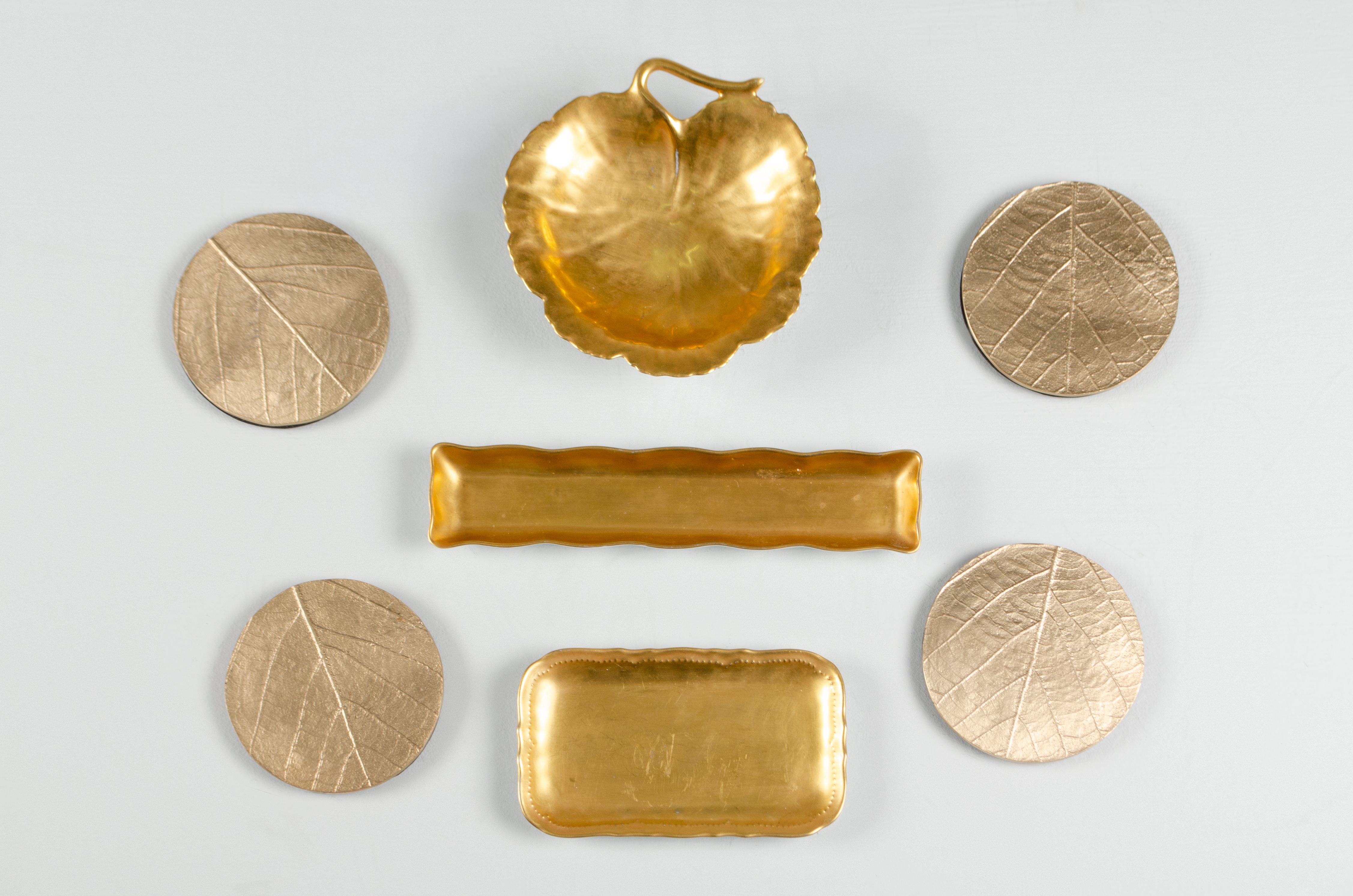 Tre porcellane rivestite in oro una a forma di foglia e due a vassoio. Quattro sottobicchieri circolari a stampo fogliaceo. Marchio di produzione.