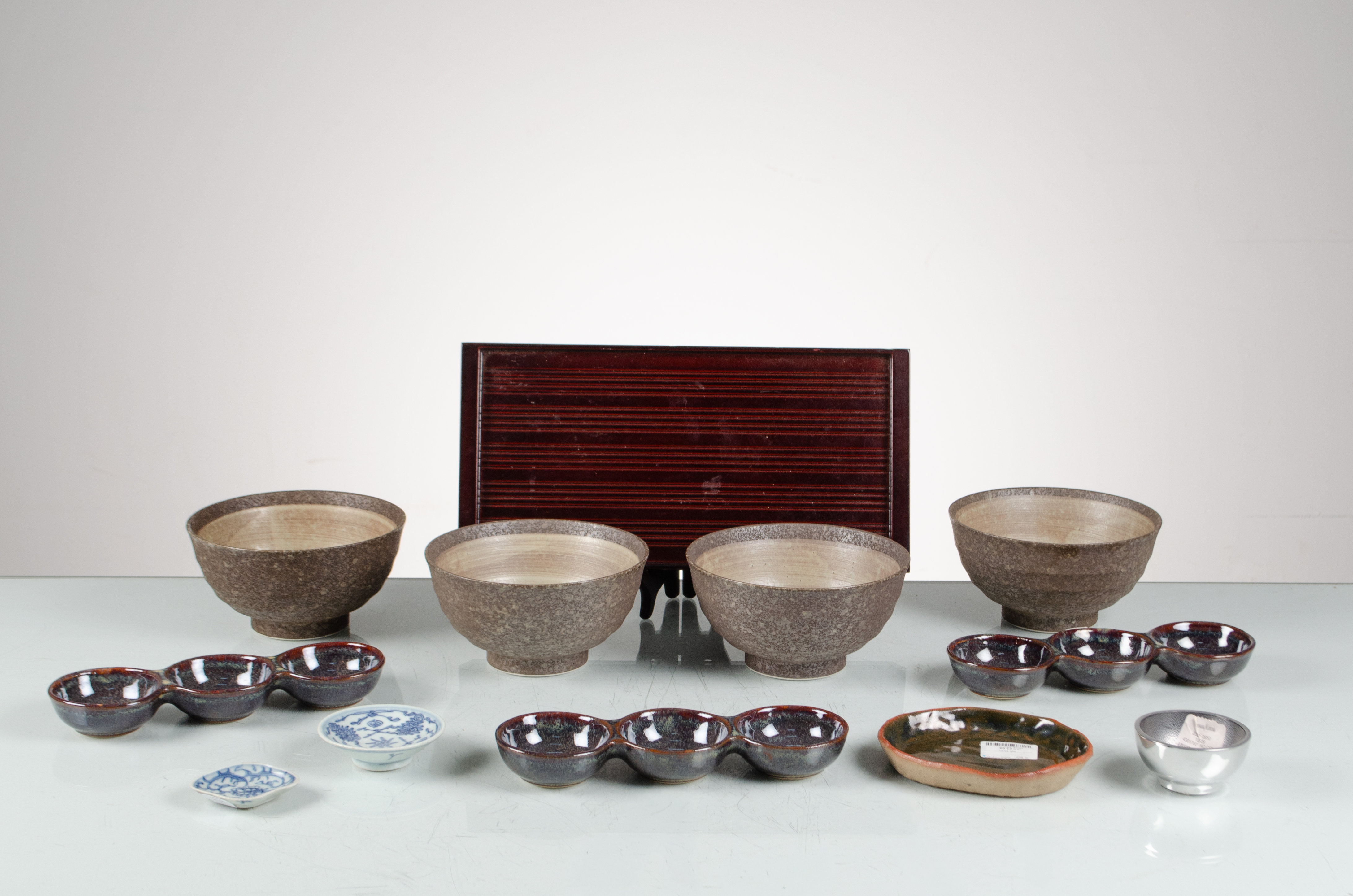 Dodici pezzi così suddivisi: un vassoio rettangolare in bamboo, quattro ciotole in grès marrone, tre set di ciotole triple in porcellana smaltata a fuoco frigio e marrone, due piccoli piattini per salsa in ceramica bianca a decoro blu, una ciotola in metallo argentato, una ciotola bassa in grès smaltato marrone. Marchi di produzione.