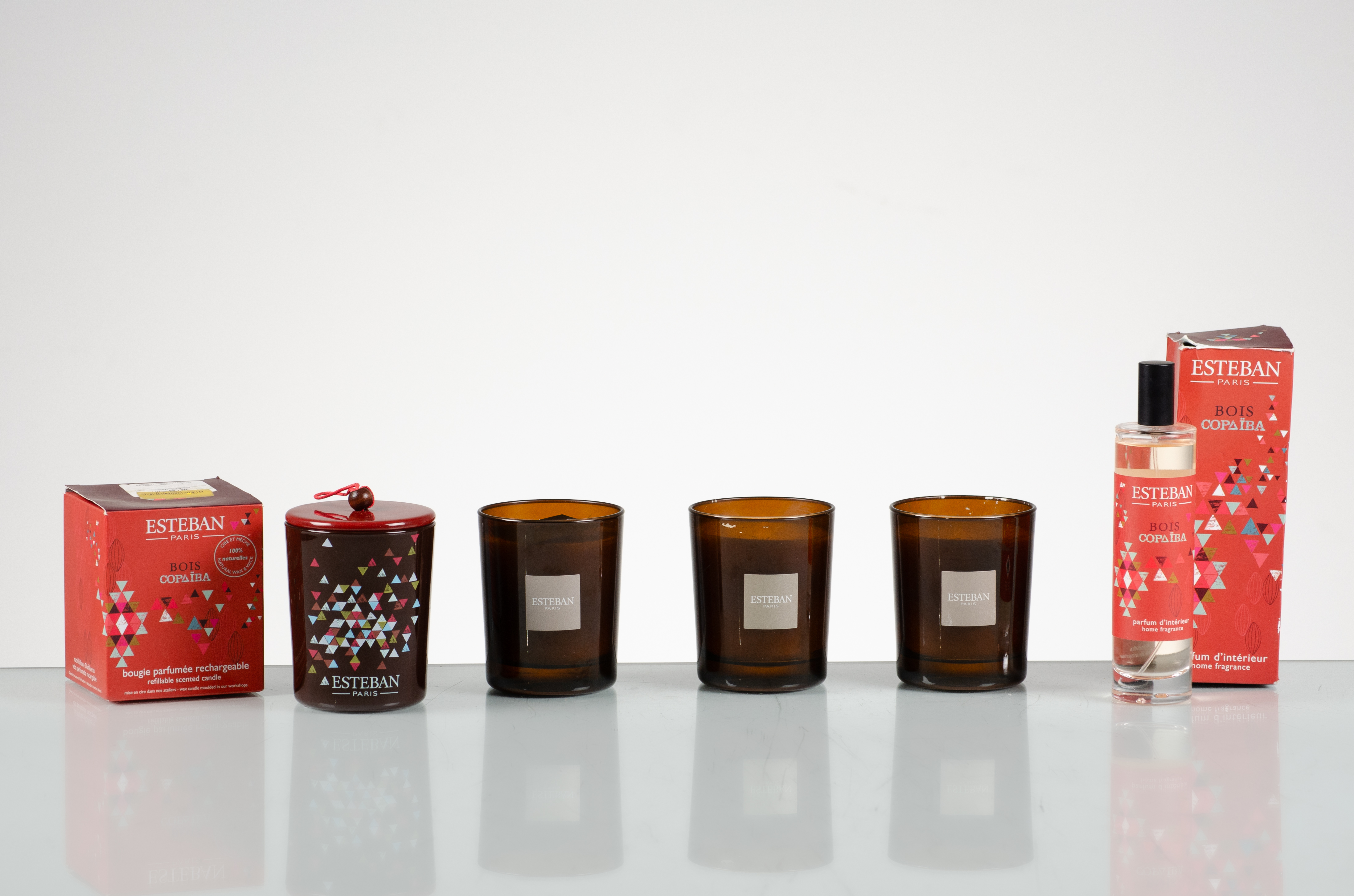 Quattro candele profumate entro bicchiere di vetro ambra. Un profumo spay per interni. Marchio di produzione.