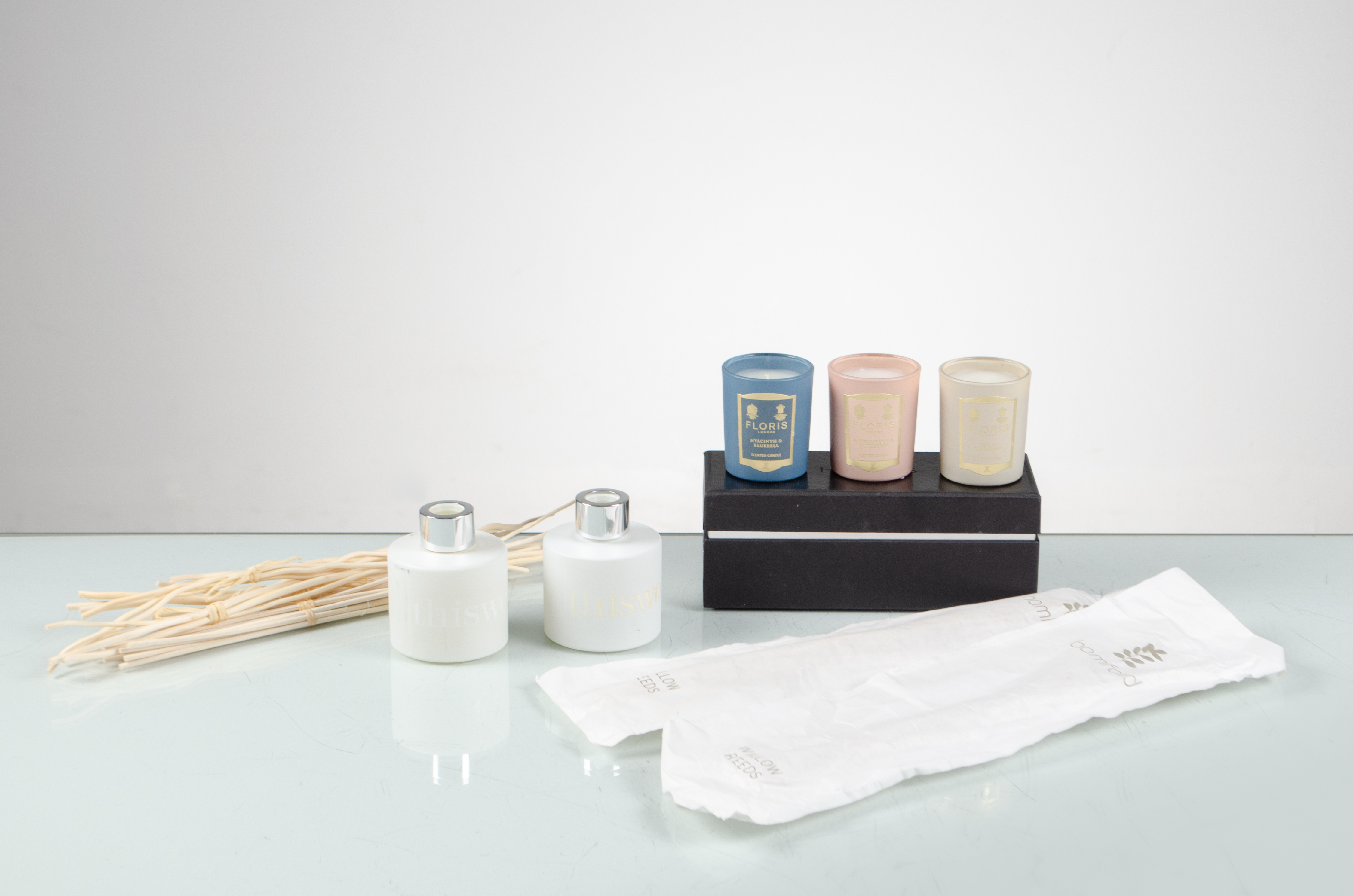 Tre candele di fragranza differente entro scatola. Due profumatori, cinque confezioni di bastoncini per profuma tori. Marchio di produzione.