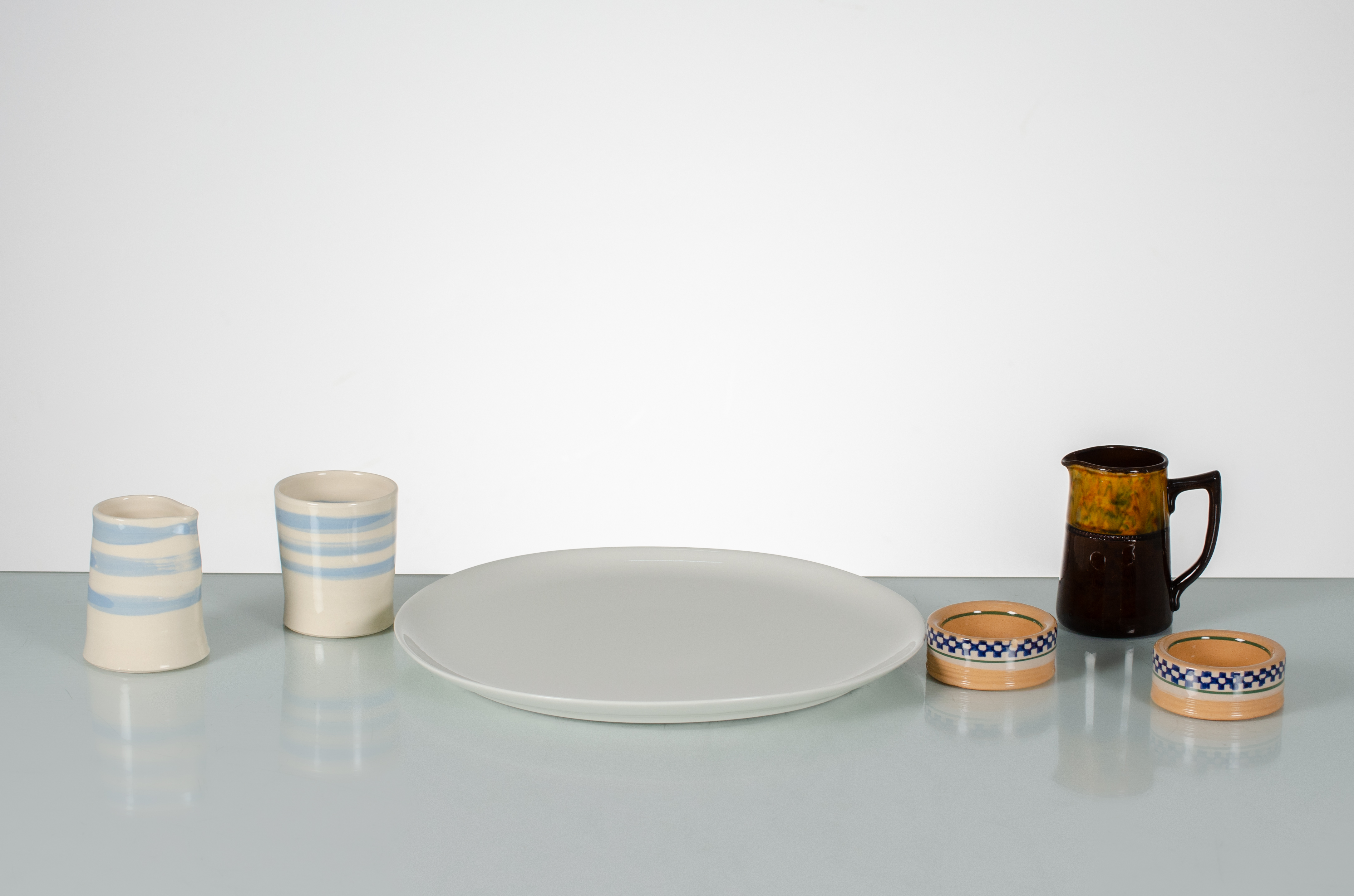Due saliere in ceramica smaltata caramello e decorate con fascia a quadri bianchi e blu, un piatto circolare in porcellana bianca, un bicchiere ed una caraffa in porcellana smaltata avorio e decorata con fasce celesti, una caraffa in ceramica smaltata marrone con decori policromi sul collo. Marchi di produzione.