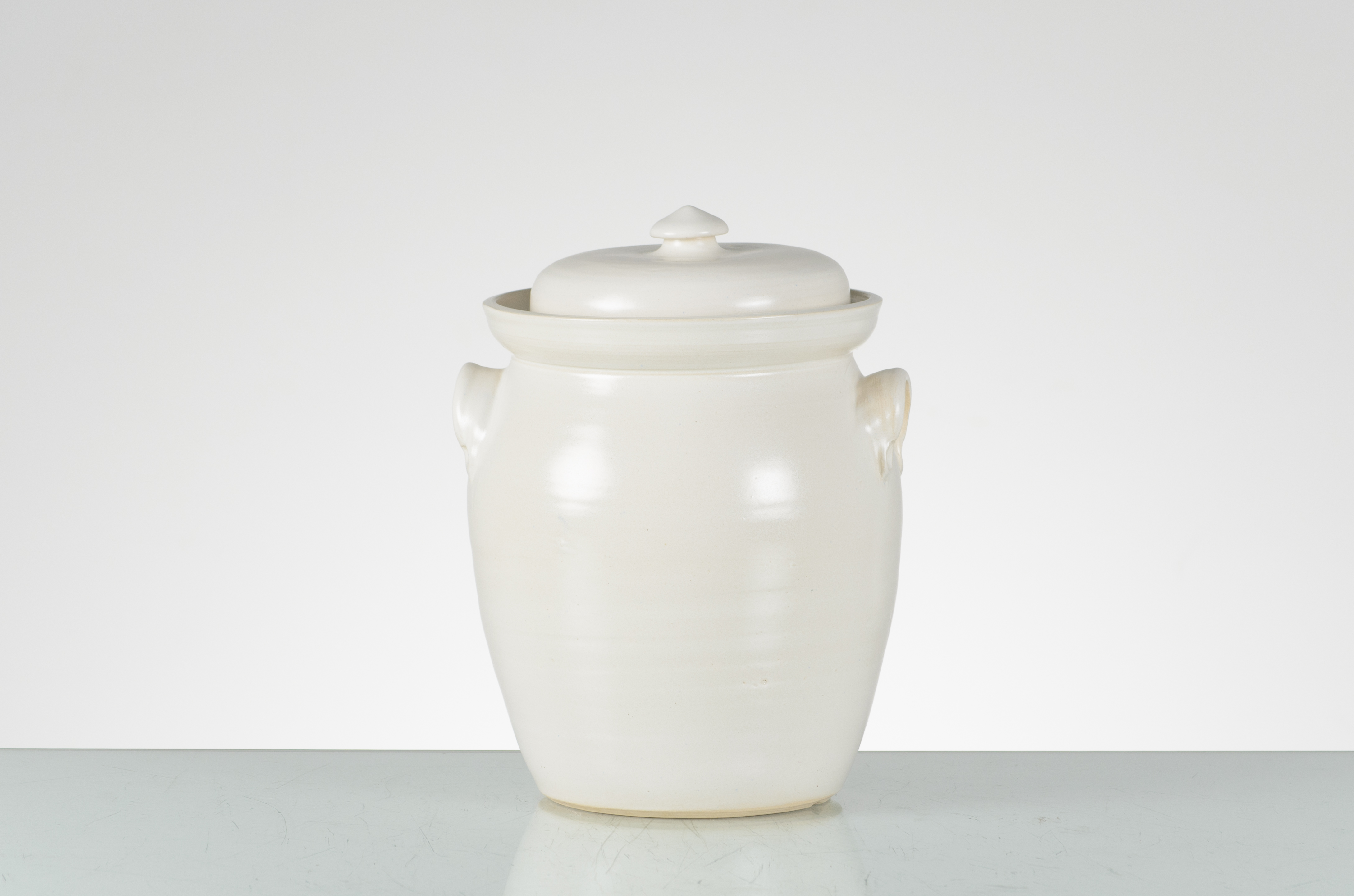 Piccola giara in grès bianco utilizzata per la fermentazione. Marchio di produzione.