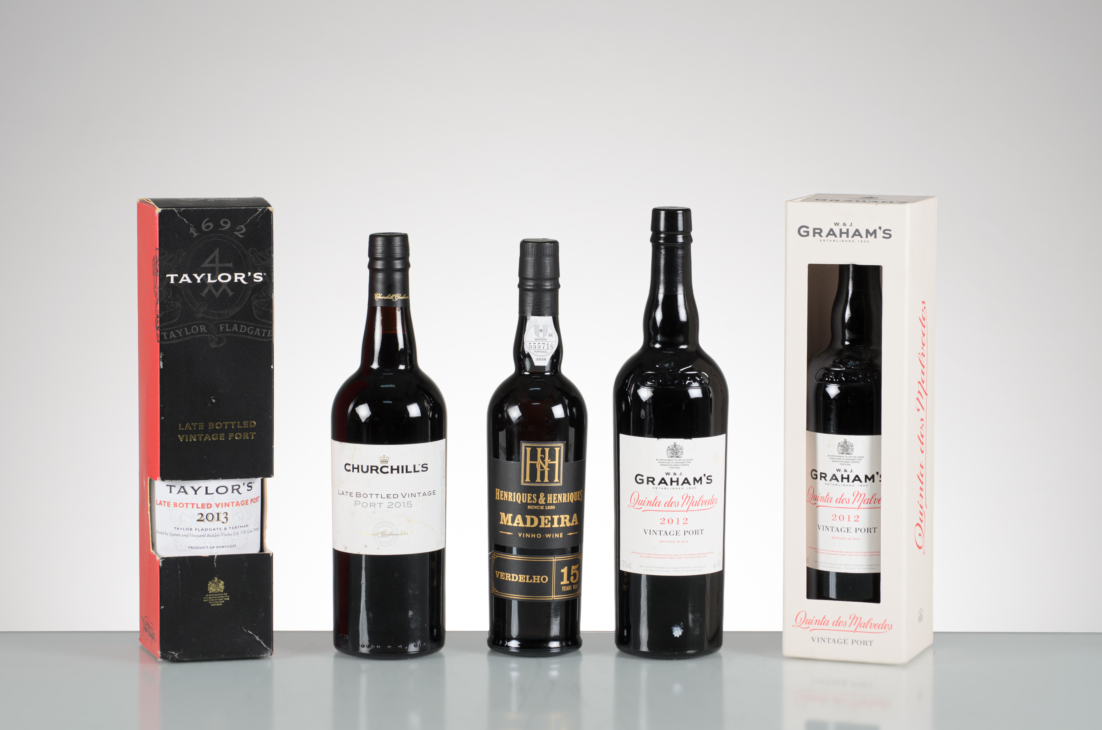 Quattro bottiglie di Porto. Una bottiglia di Madera. Marchio di produzione.