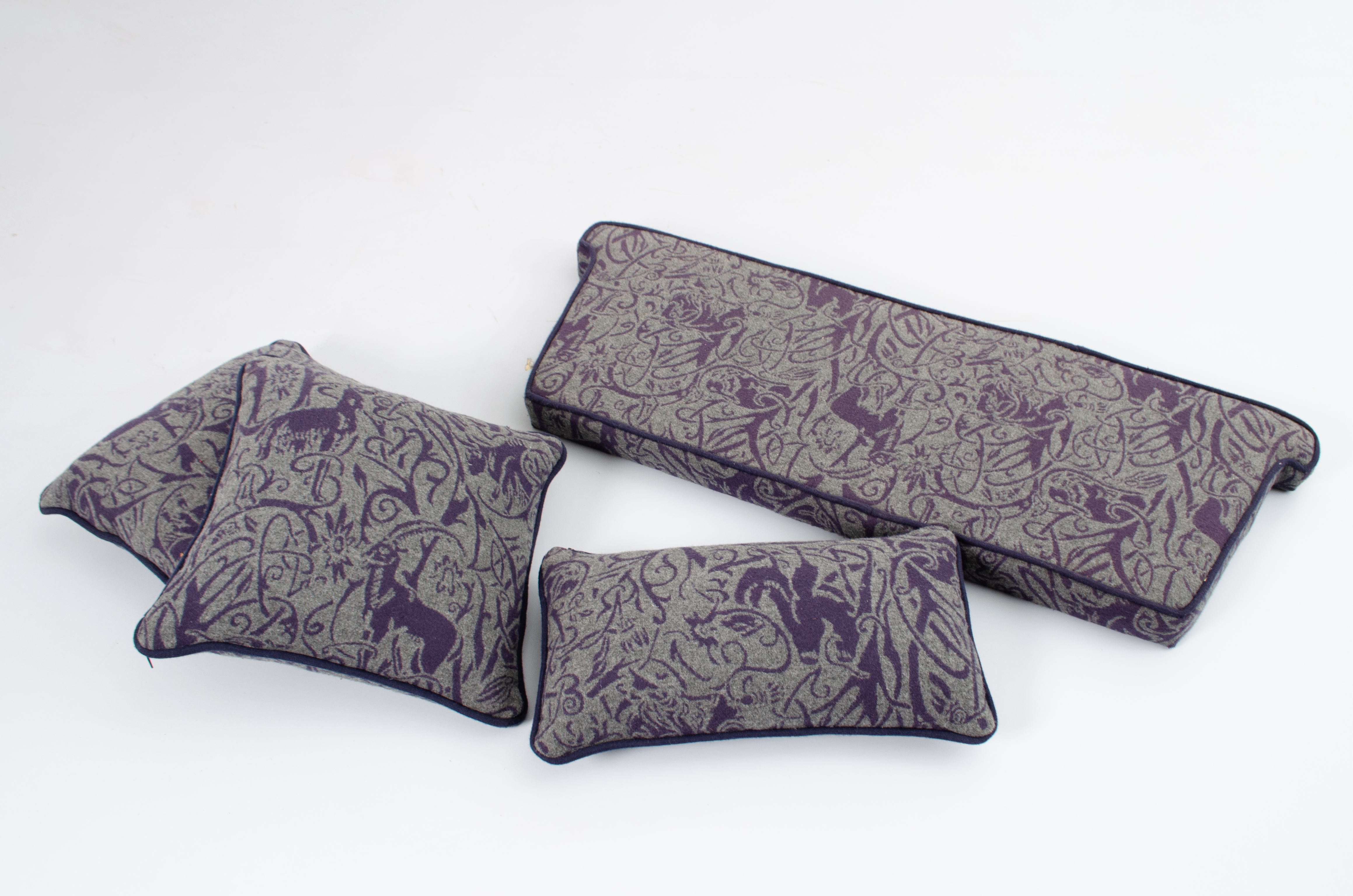 Tre cuscini ed una seduta per finestra di dimensione differente con imbottitura e rivestimento in lana grigia con decori viola.