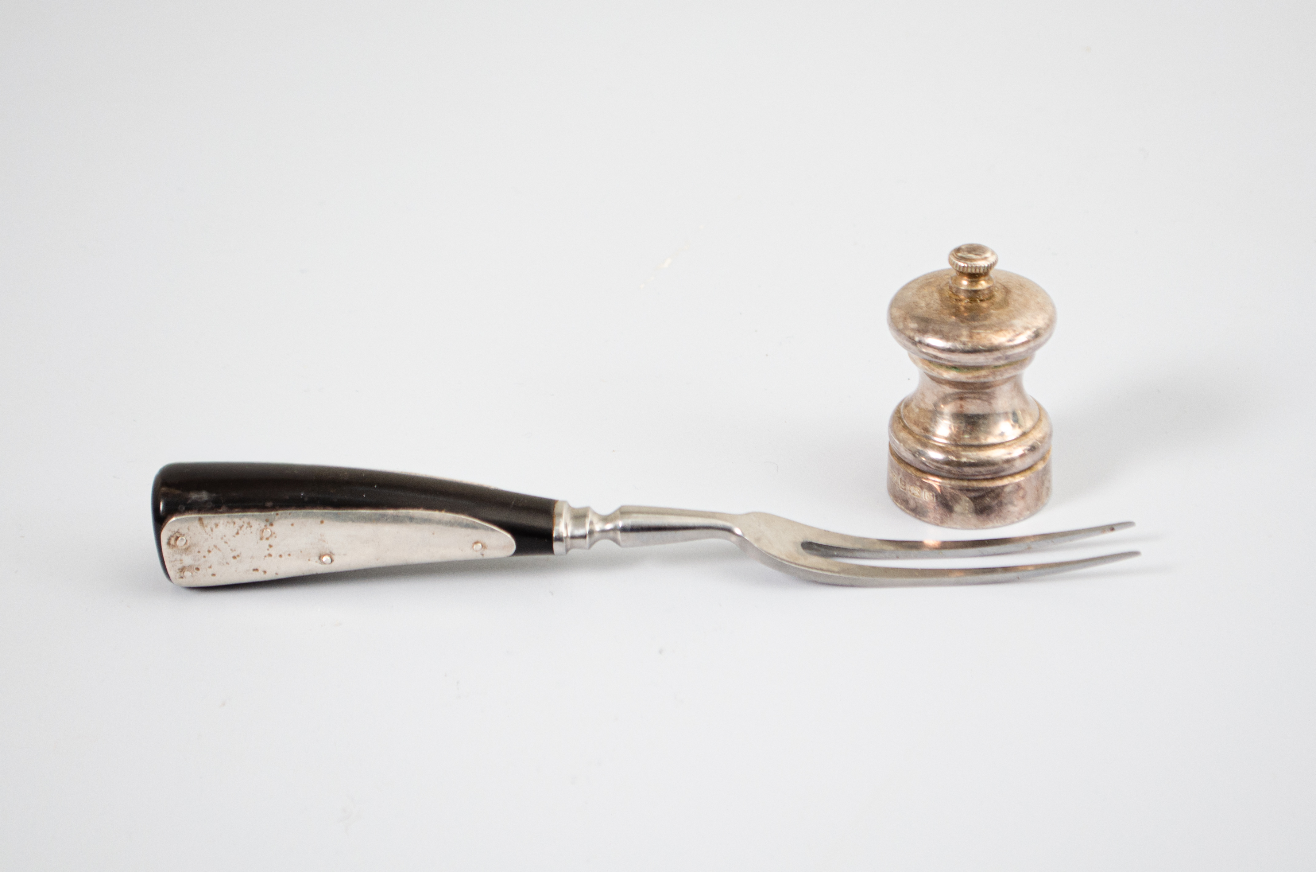Un forchettone per carni ed una macina pepe in silver. Punzoni.