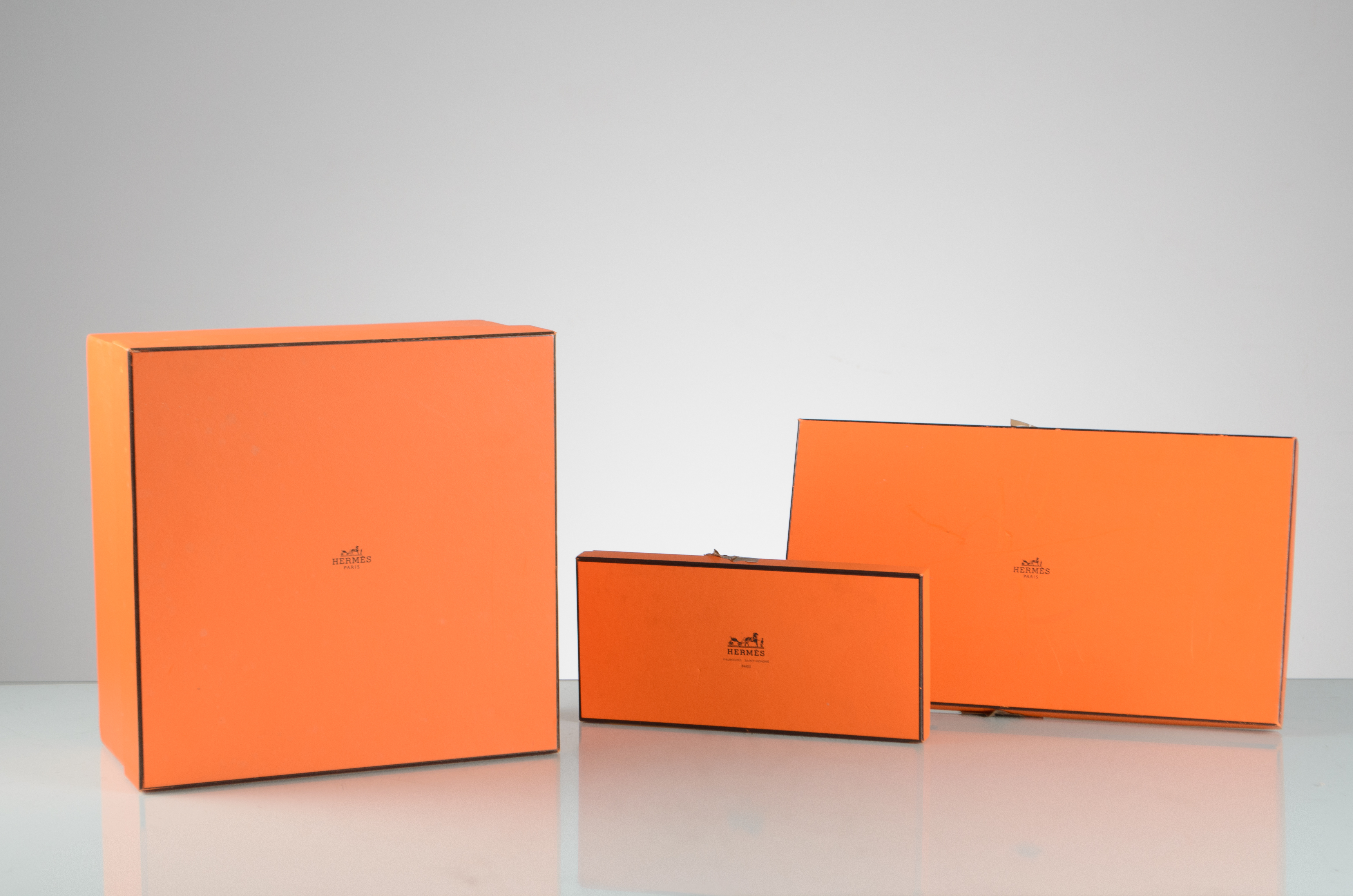 Tre scatole in cartone arancione con logo di dimensione diversa. Segni di uso. Marchio di produzione.