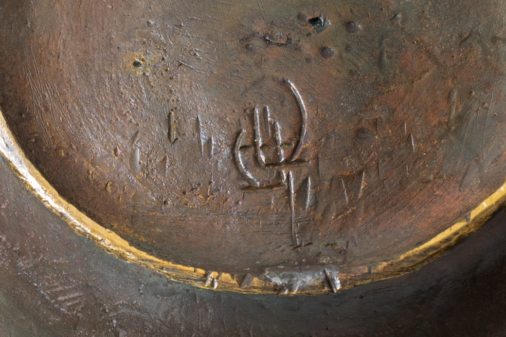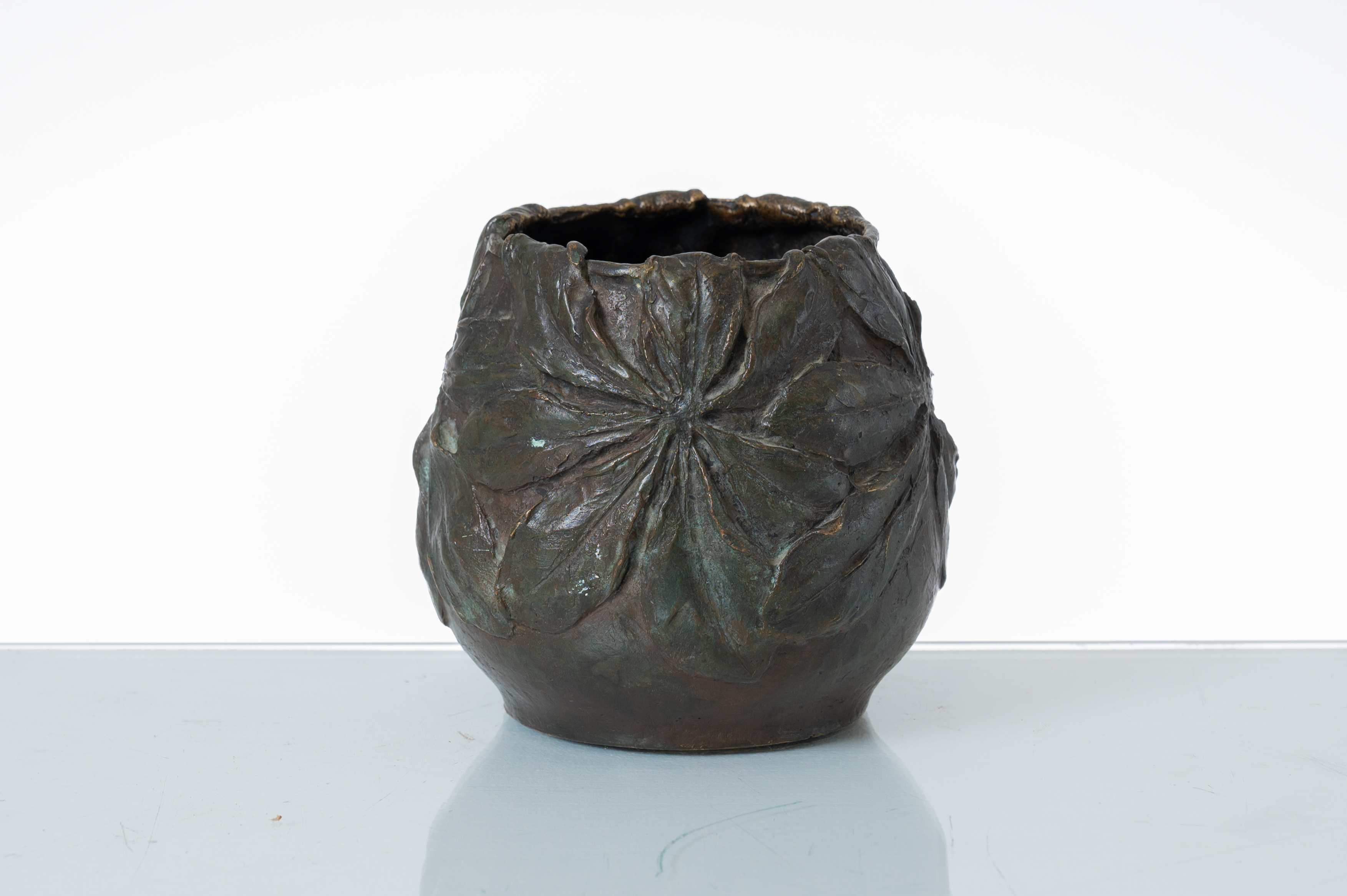 Piccolo vaso in bronzo, fusione a cera persa a motivo fogliaceo. Reca monogrammi sul fondo.