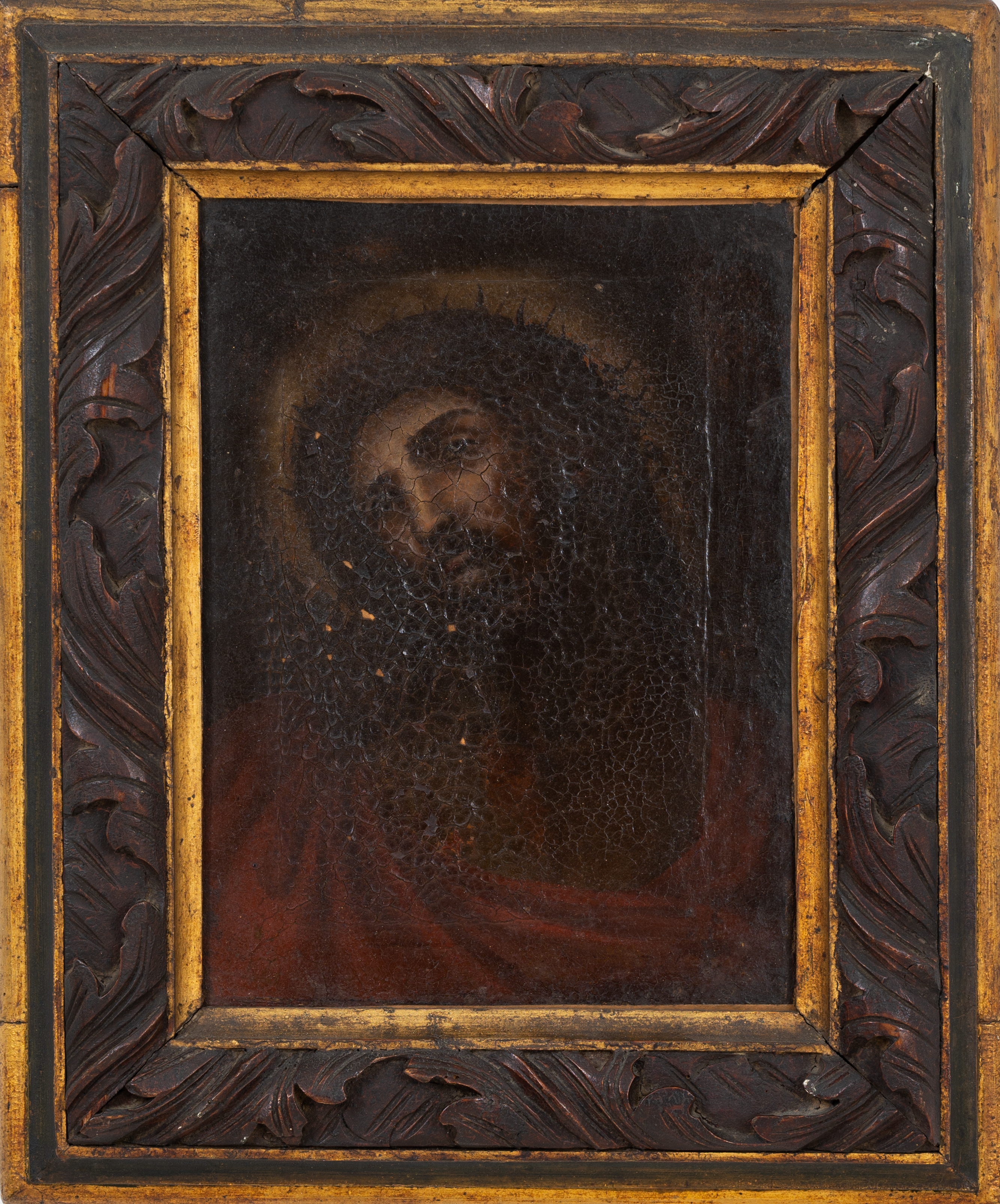 Cornice in legno scolpito con bordure dorate (usure).