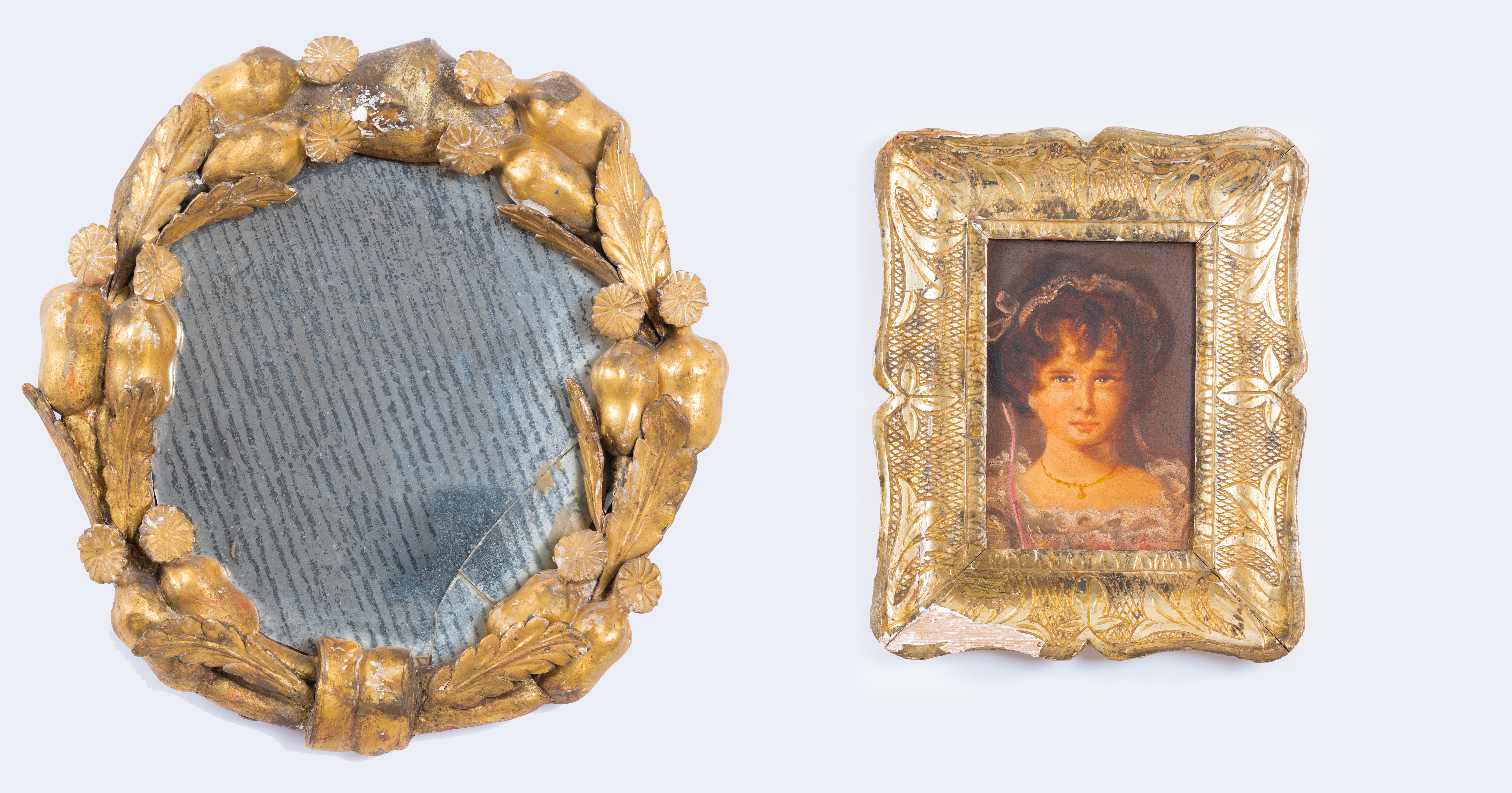 Cornice a guantiera in legno dorato ad argento a mecca con olio su tavoletta raffigurante "Ragazza" e piccola specchiera in legno intagliato, doratura ad oro zecchino.